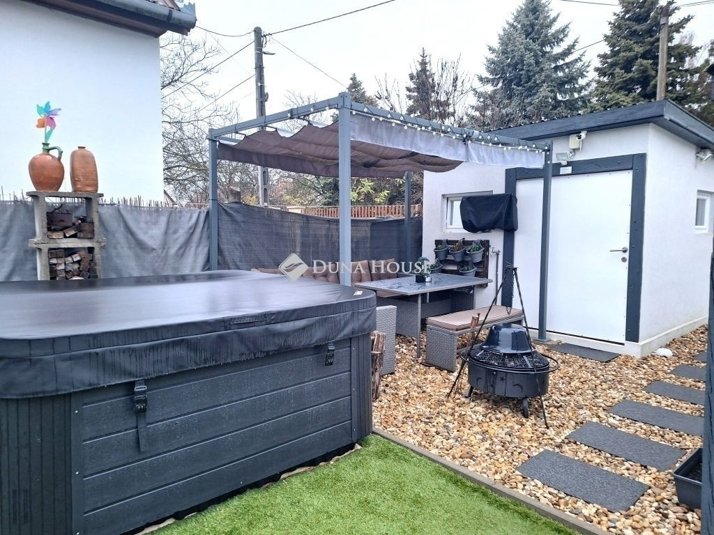 - Az udvar jelenleg műfűvel borított, de az automata öntöző ki van építve