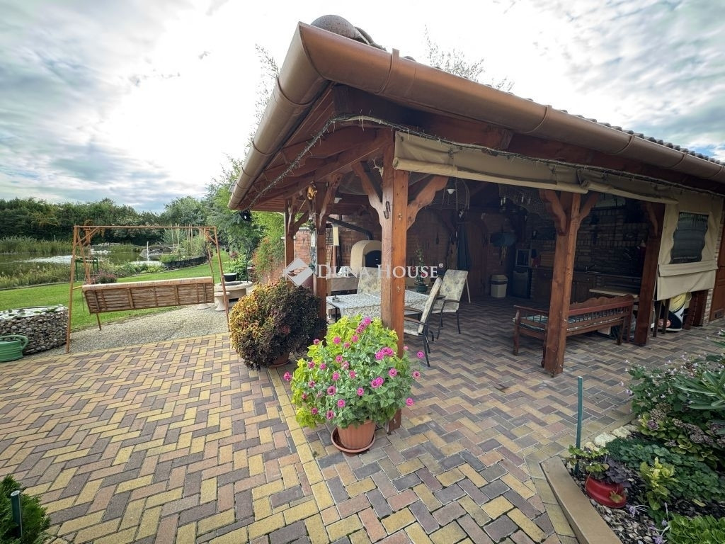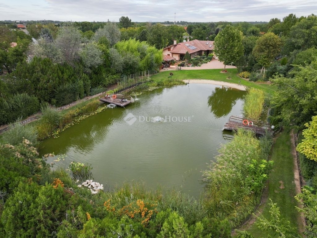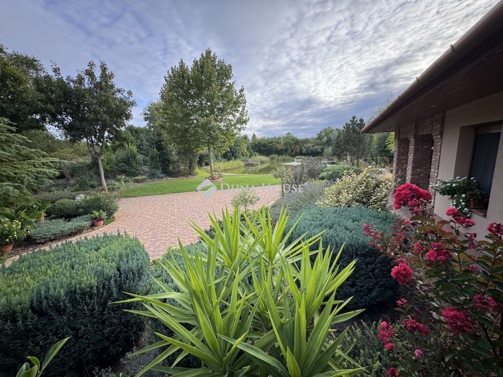 Az udvar különlegessége a 2 250 m² vízfelületű, 2,5 méter mélységű speciális tófóliával ellátott kerti tó, mely kivételes hangulatot kölcsönöz az ingatlannak.