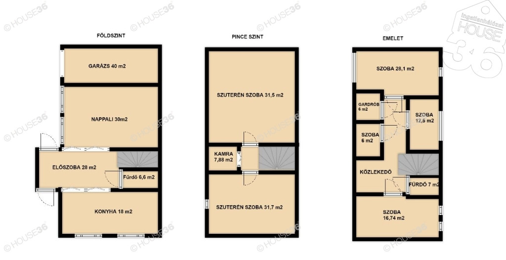 emeleten: három hálószoba, egy dolgozószoba és fürdőszoba található