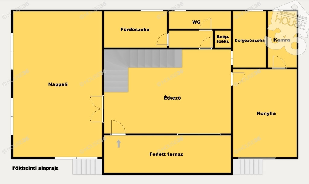 Tágas helyiségek (földszinti nappali: 30 m2; emeleti hálószoba: 25 m2);