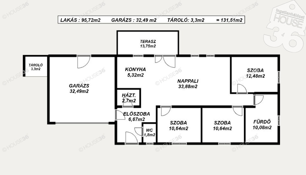 - Lakótér 96 m2, dupla garázs 32 m2, terasz 14 m2, tároló 3,3 m2, 480 m2 telek (lásd alaprajzon)