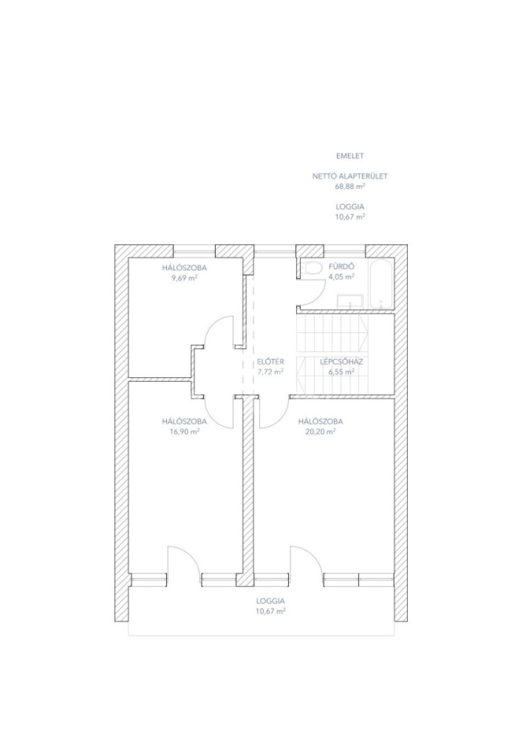 • Elosztás: A földszinten egy tágas nappali, a konyha étkezővel és egy WC található, míg az emeleten 3 külön nyíló hálószoba és egy fürdőszoba kapott helyet.