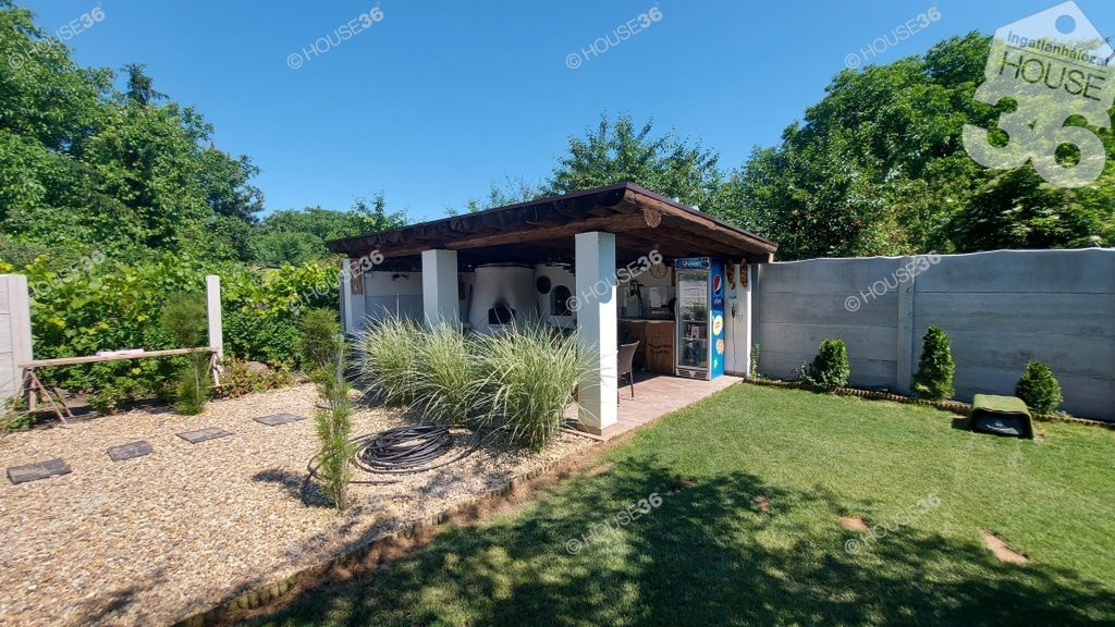 -burkolt 26 m2-es terasz, 12 m2-es melléképület + sütögető, bográcsozó, épített kemence