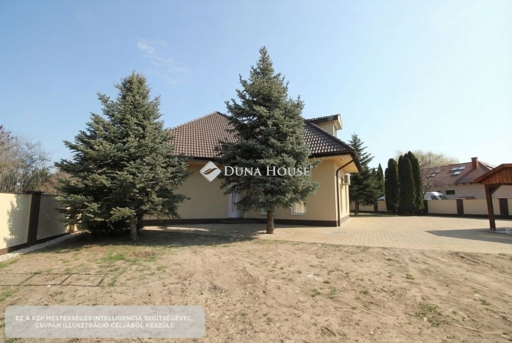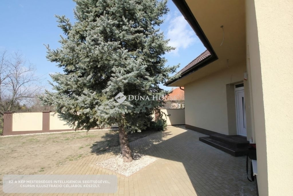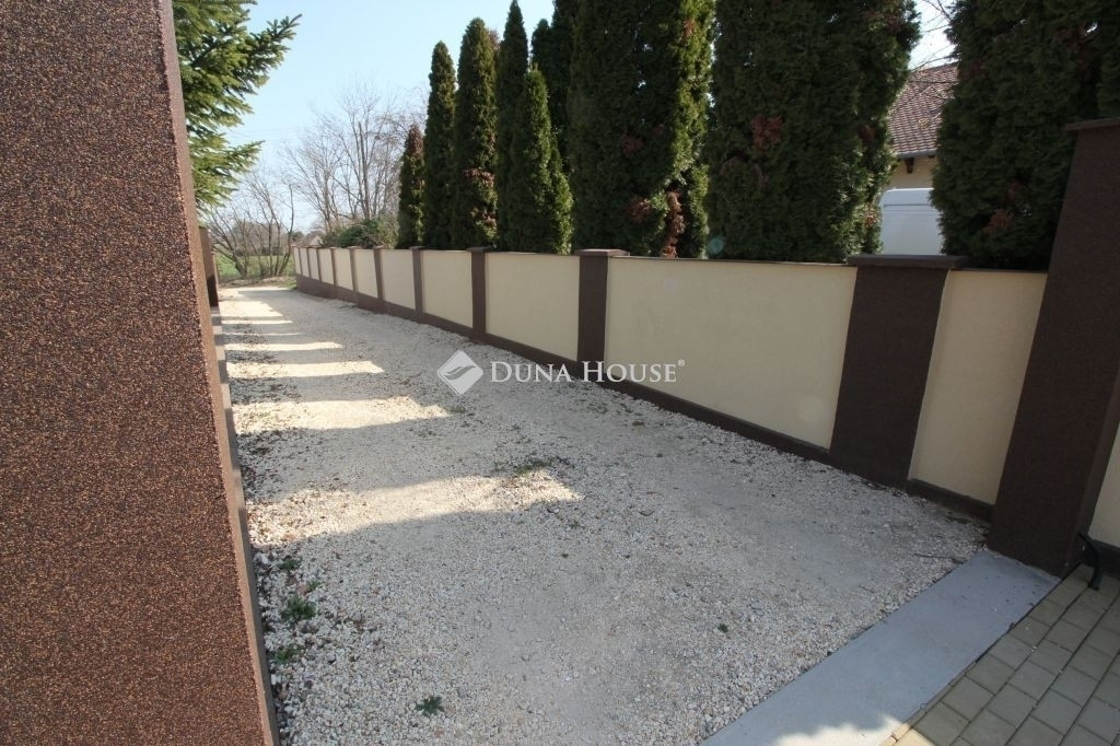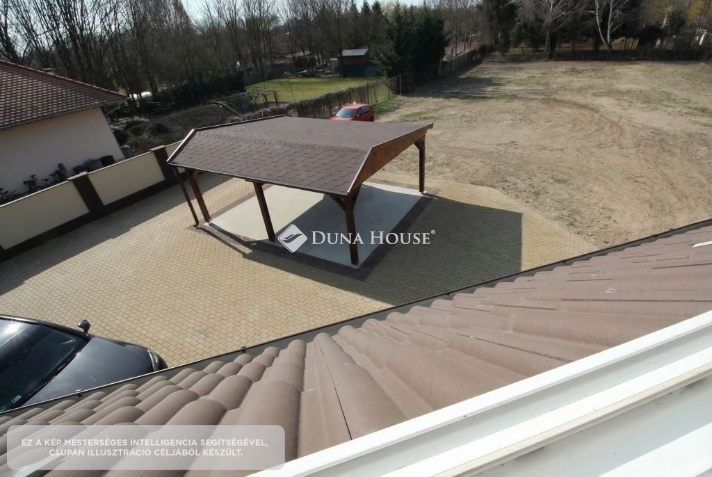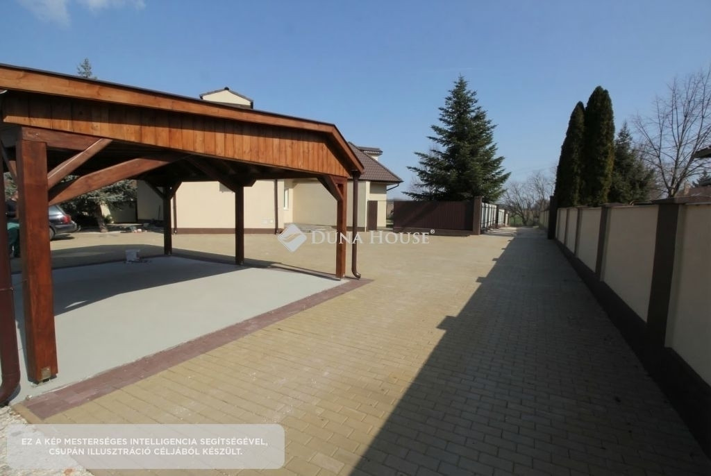 A ház körül több száz négyzetméter térkövezett felület található, valamint dupla fedett autóbeálló is rendelkezésre áll. A telek külön bejárattal rendelkezik, elektromos kapun keresztül közelíthető meg.
