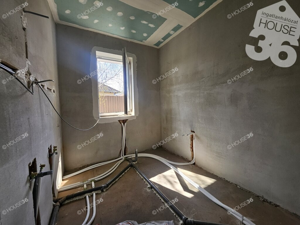 Kecskeméten, a Hunyadiváros újépítésű részén, aszfaltozott utcában, hátsó, nyeles, osztott telken (használati megosztással), 519 m2-es, teljesen körbekerített telken, 95,69 m2-es, nappali + 3 szobás családi ház, 2026 nyári átadással eladó! Jelenleg a ház már tető alatt áll, gépészeti-és burkolási munkák folynak.