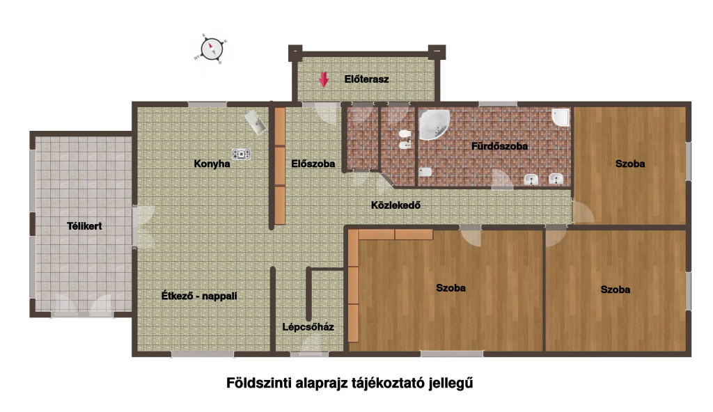 - földszint 131 m2 (az épületben összesen 4 szoba található, amelyből 3 db hálószoba, 1 db konyha-étkező-nappali, további kiszolgáló helyiségek,