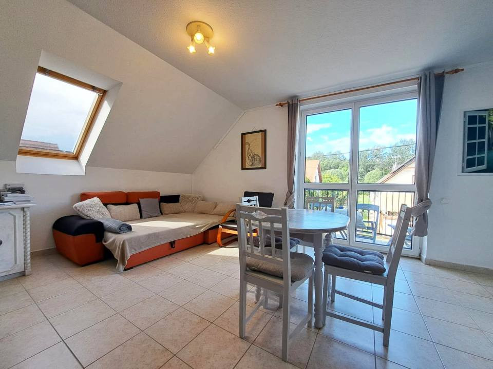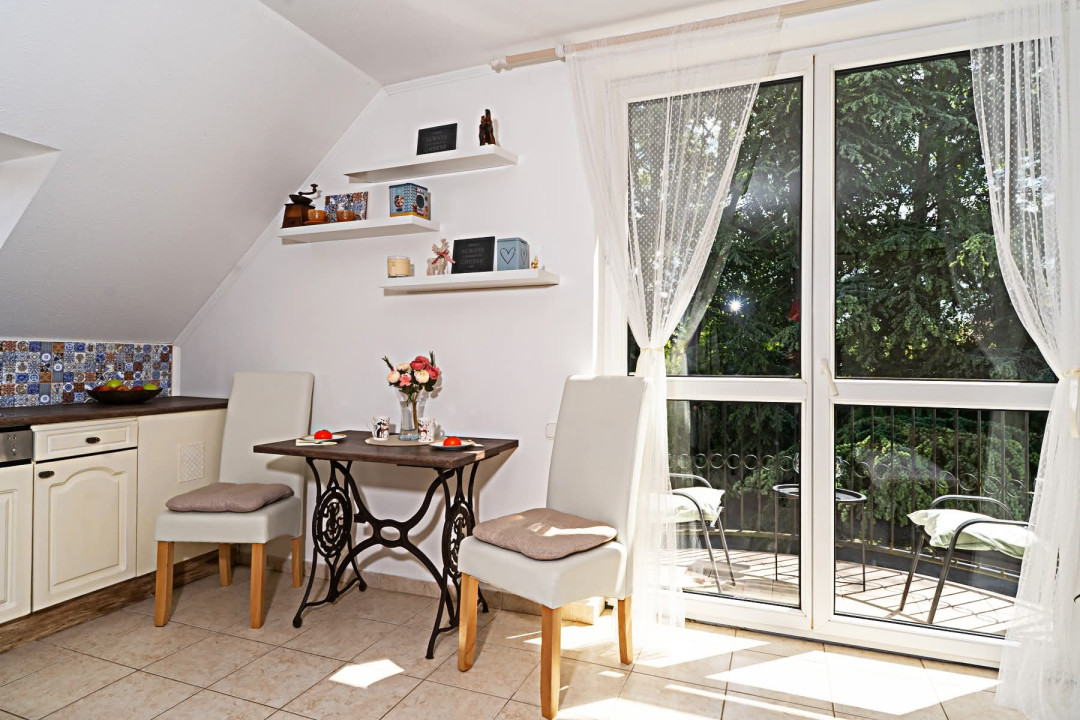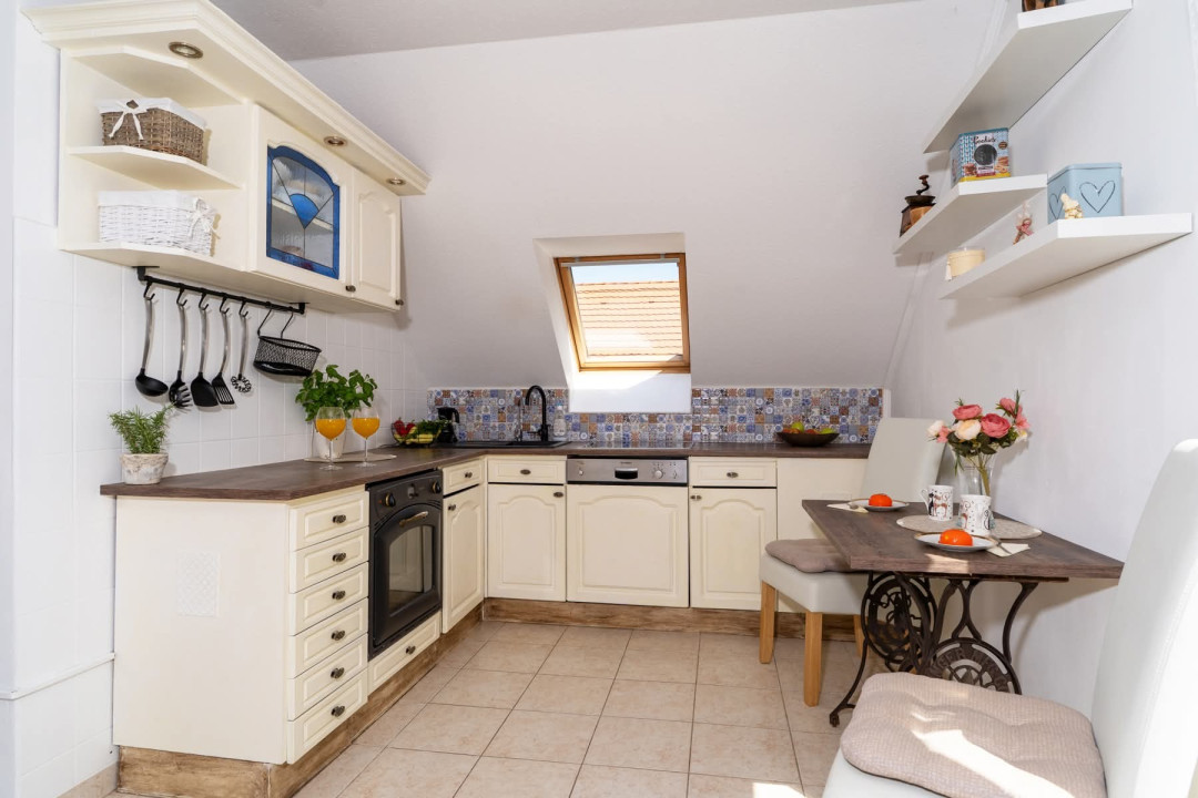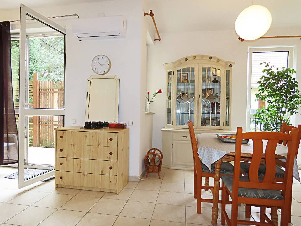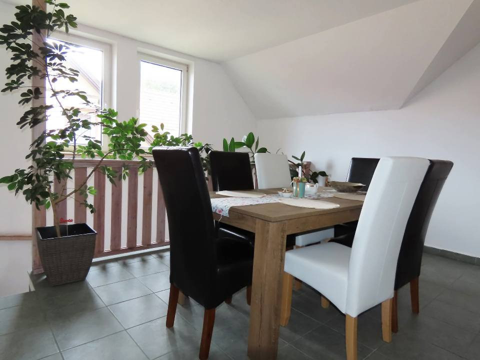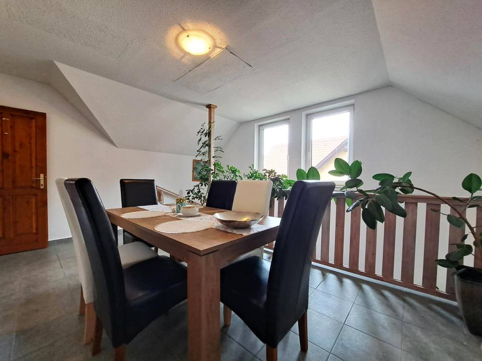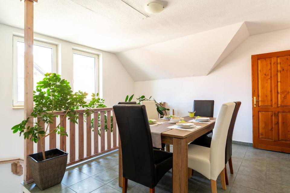 Az emeletre felérve egy tágas étkező került kialakításra, ahol nagyobb létszám is kényelmesen elfér, kiváló helyszíne közös vacsoráknak, beszélgetéseknek.