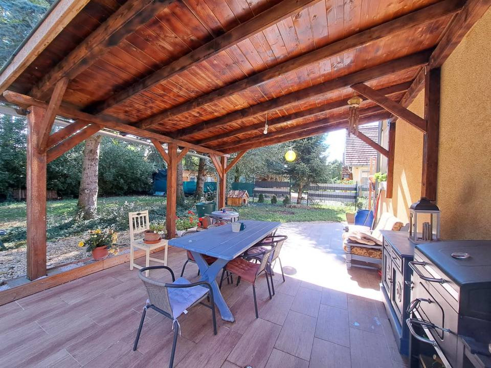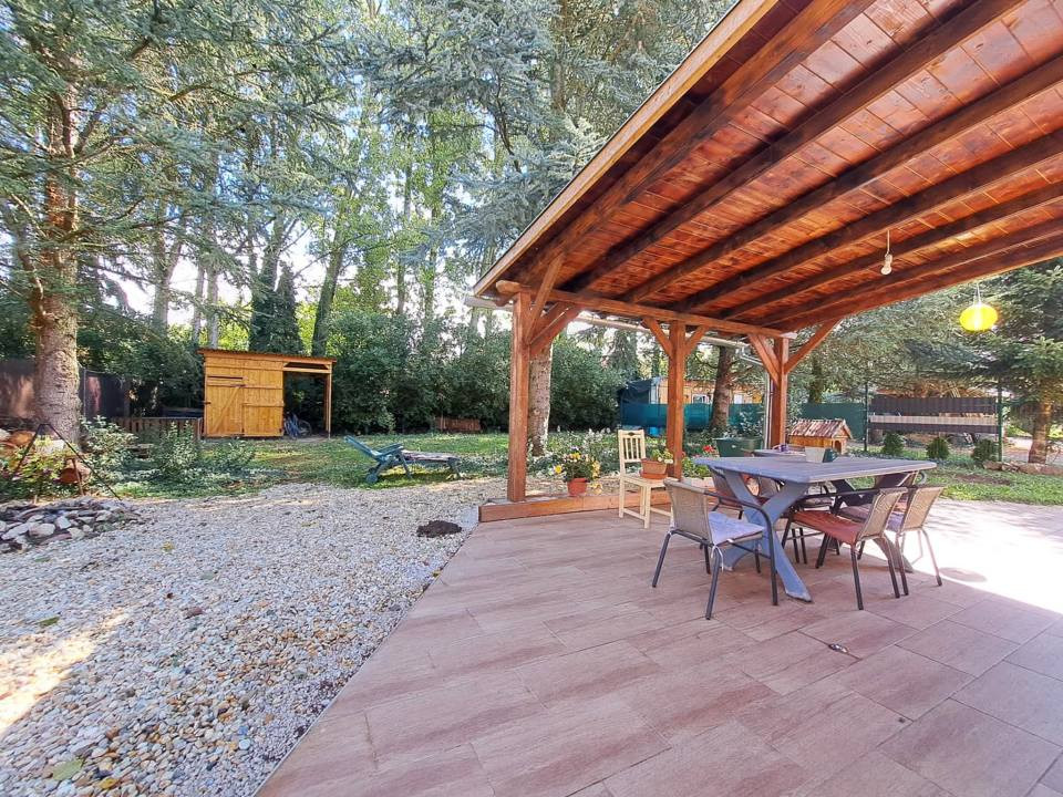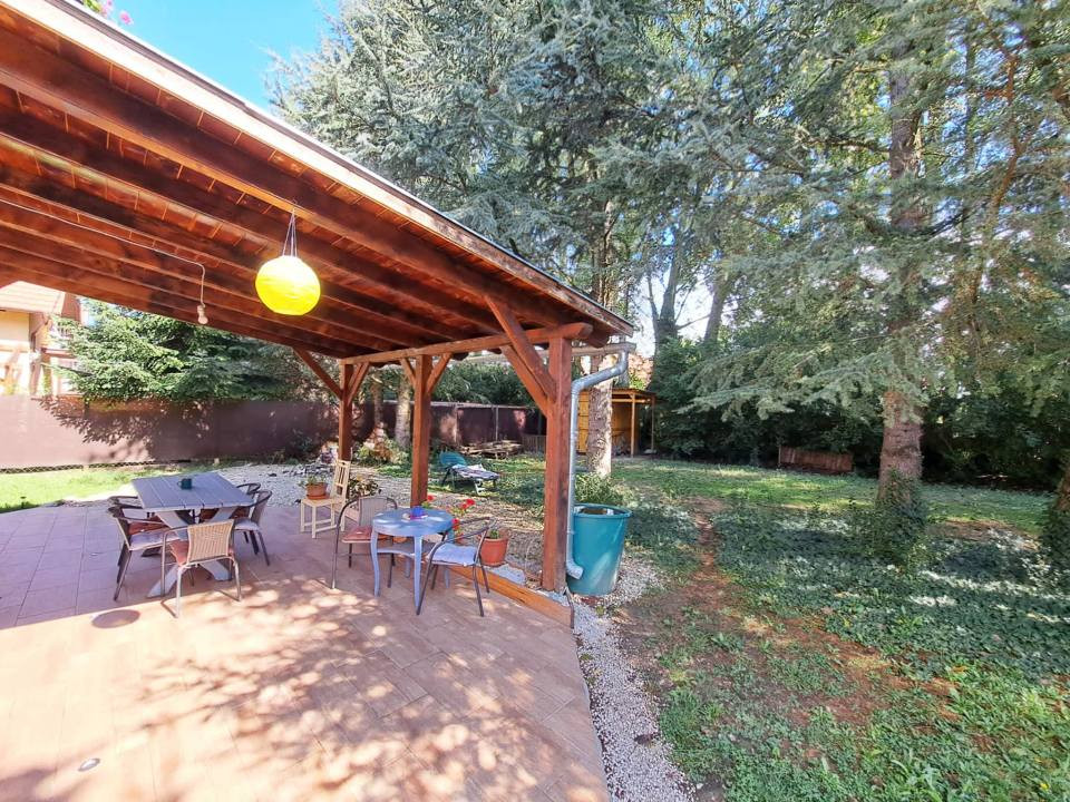 A ház mögött egy tágas, fedett terasz található, ahol kényelmesen elférnek a kerti bútorok, kerti sütő/főző berendezések. Az udvar nagy részét pázsit borítja, rajta örökzöldek, virágok, találhatók még.