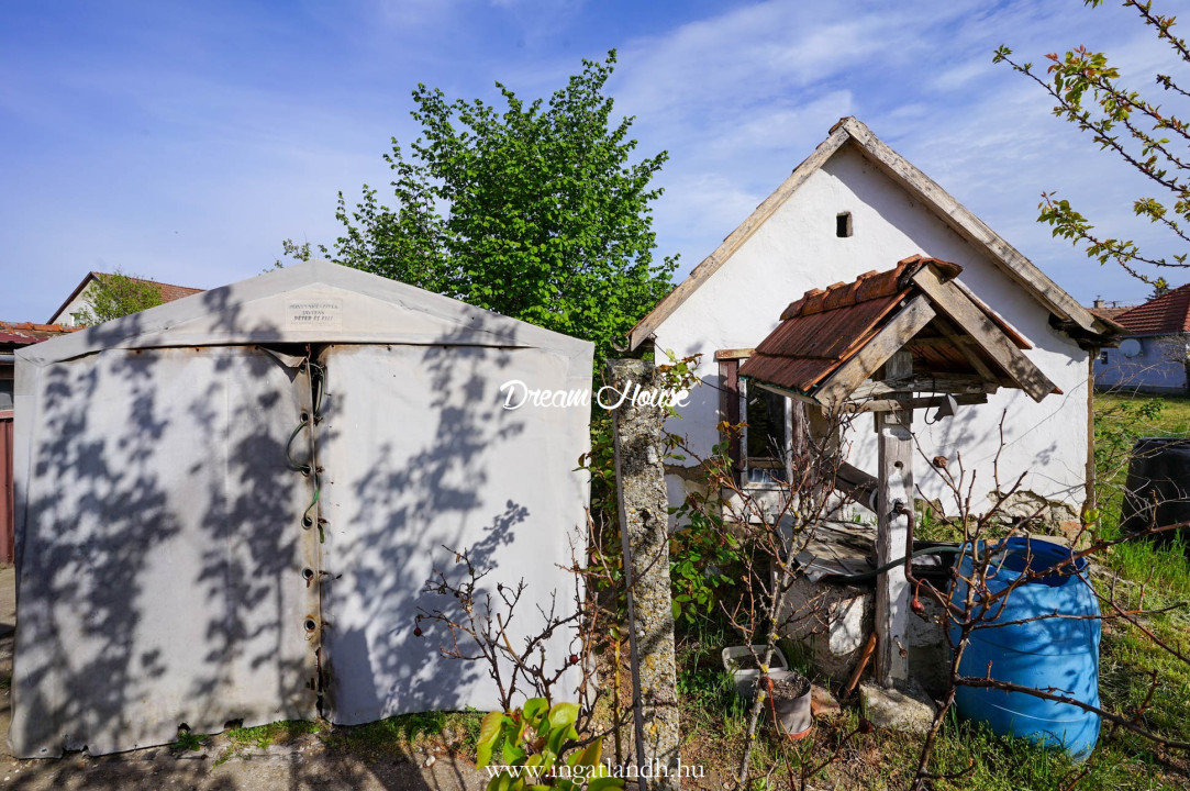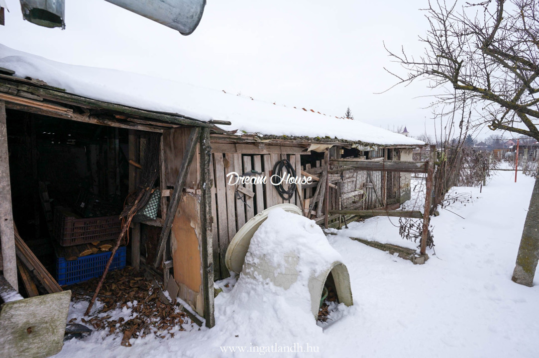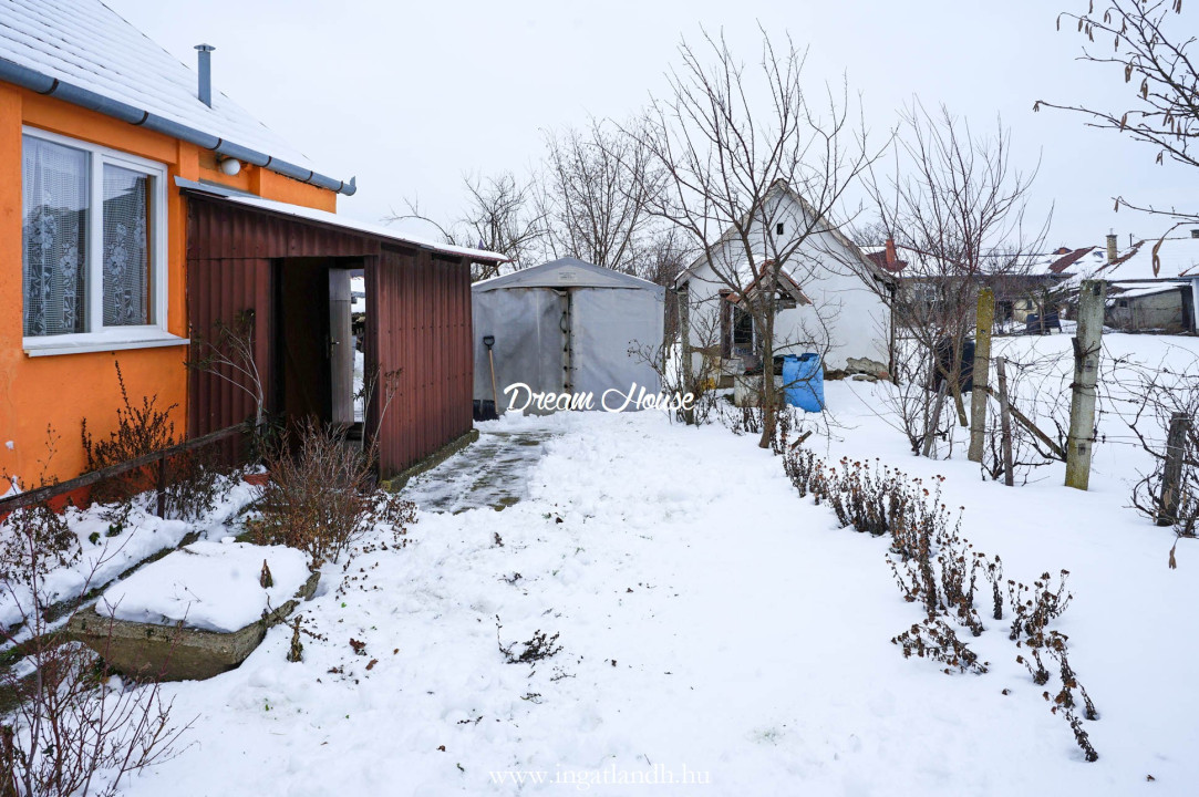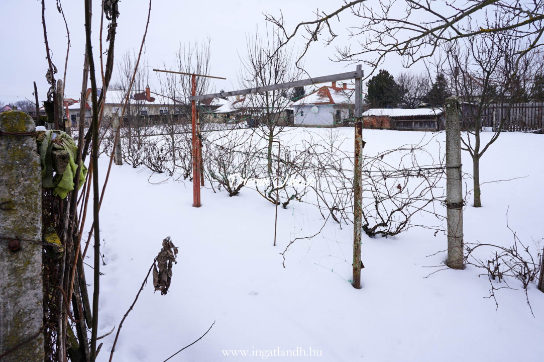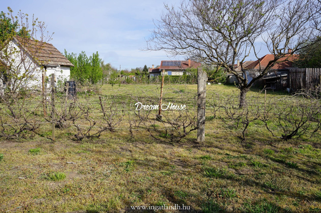 A 1410 m²-es telek 29 méter utcafronttal rendelkezik, rendezett udvarral, fiatal gyümölcsfákkal és szőlővel.