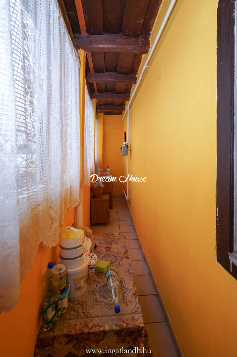 A ház egyik különleges hangulati eleme a látszó gerendás mennyezet, amely autentikusan idézi a régi korok, parasztházak, vidéki otthonok eredeti stílusát.