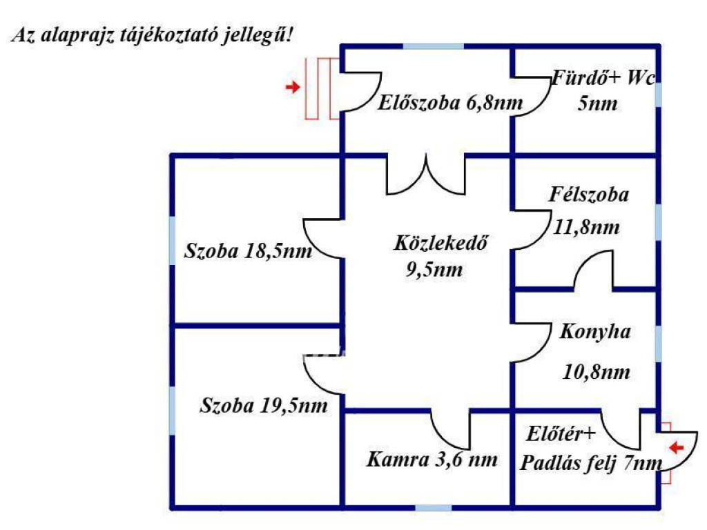 Belső elrendezés: előtér, fürdőszoba WC-vel, konyha, kamra,közlekedő, 2,5 tágas szoba, padlásfeljáró