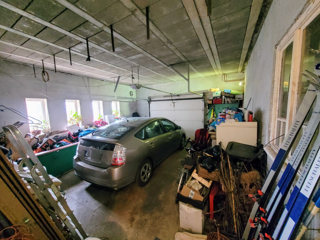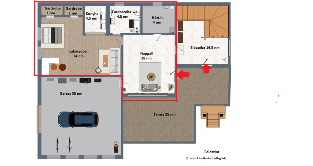Az alsó szinten előtér, nappali, konyha (jelenleg tároló), hálószoba, gardrobe helyiségek, felújított fürdőszoba, háztartási helyiség találhatóak, valamint a garázs