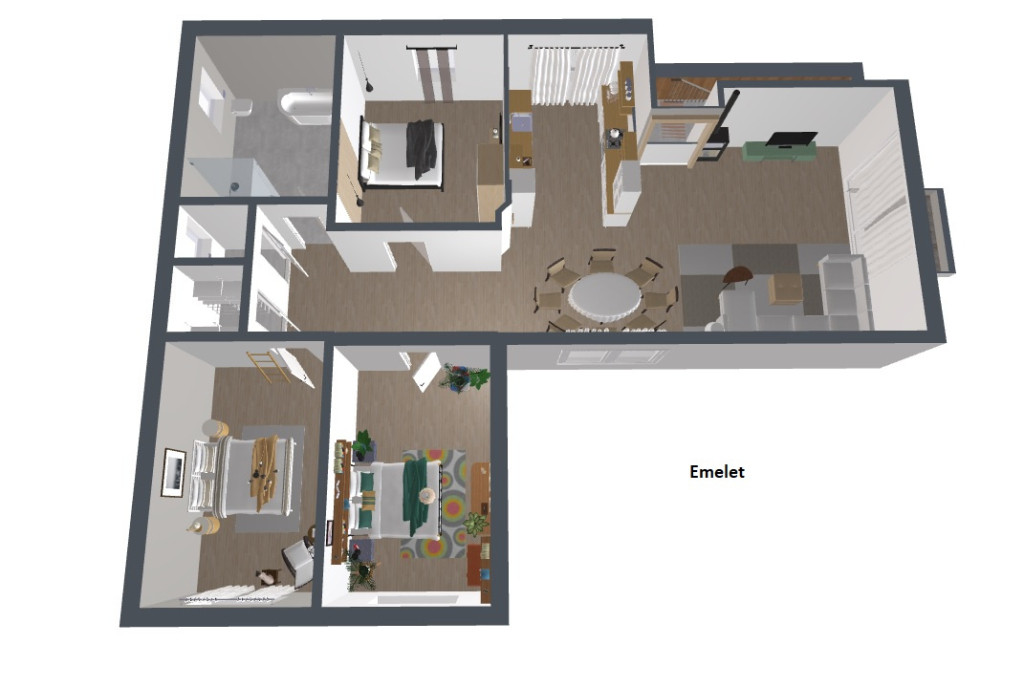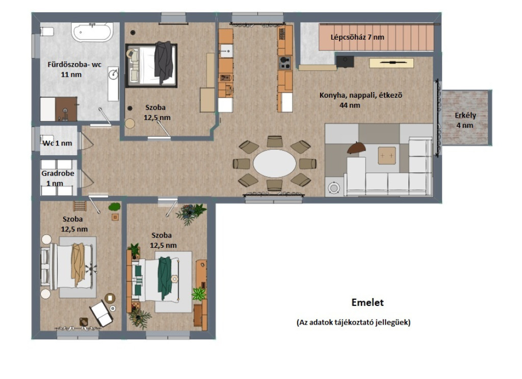 Az emeleten egy nagy méretű, gépesített amerikai konyhás nappali, étkező, 3 hálószoba, fürdőszoba-wc (sarokkáddal és tusolóval), gardrobe és egy plusz kézmosós wc is található.