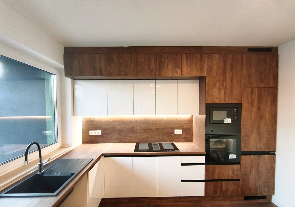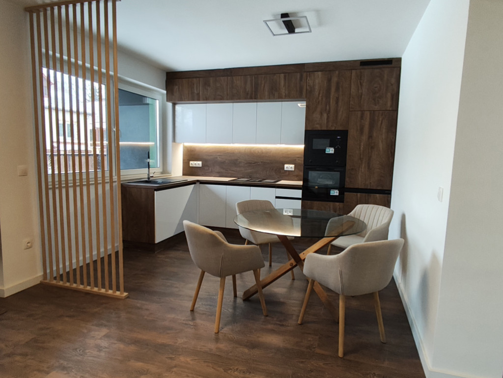 A földszint központi tere egy tágas, világos nappali amerikai konyhával, amely közvetlen kapcsolatban áll a 13 m²-es terasszal, így ideális helyszíne lehet családi és baráti összejöveteleknek. Ezen a szinten egy hálószoba, egy gardróbhelyiség, egy zuhanyzós fürdőszoba dupla mosdóval, valamint egy külön mellékhelyiség kapott helyet. A modern konyha teljesen új, beépített bútorral és gépekkel felszerelt – hűtőszekrénnyel, sütővel, mikróval, mosogatógéppel és főzőlappal elszívóval –, melyek a vételár részét képezik.