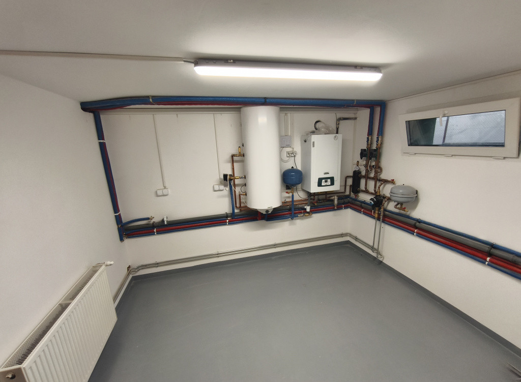 Az otthon komfortjáról korszerű gépészet gondoskodik. A fűtést kondenzációs gázkazán biztosítja, a meleg vizet pedig hőtárolós bojler szolgáltatja, amely gázról és elektromos áramról is működtethető. A rendszer kialakítása lehetővé teszi, hogy később akár hőszivattyús fűtésre is átállítható legyen. A földszinten és az emeleten padlófűtés biztosítja az egyenletes meleget, míg a szuterénben radiátorok kerültek kialakításra. A kellemes hőmérsékletről három inverteres klíma gondoskodik, amelyek hűtésre és fűtésre egyaránt alkalmasak. Az energiahatékonyságot 10 cm-es homlokzati szigetelés és 25 cm-es tetőszigetelés segíti.