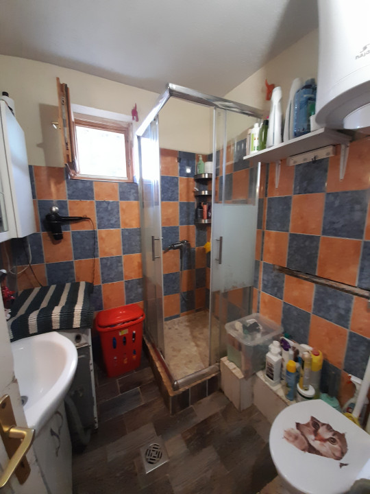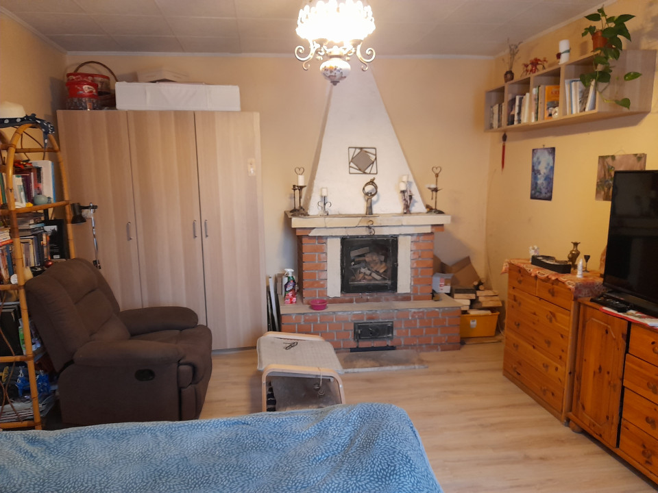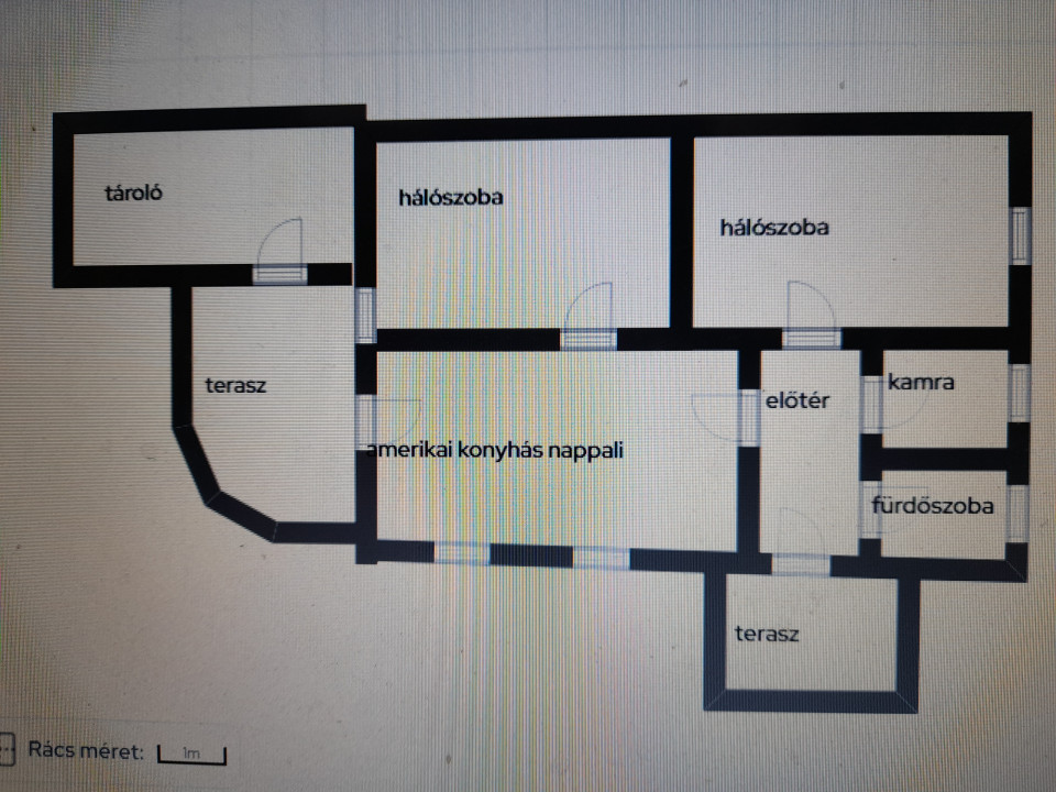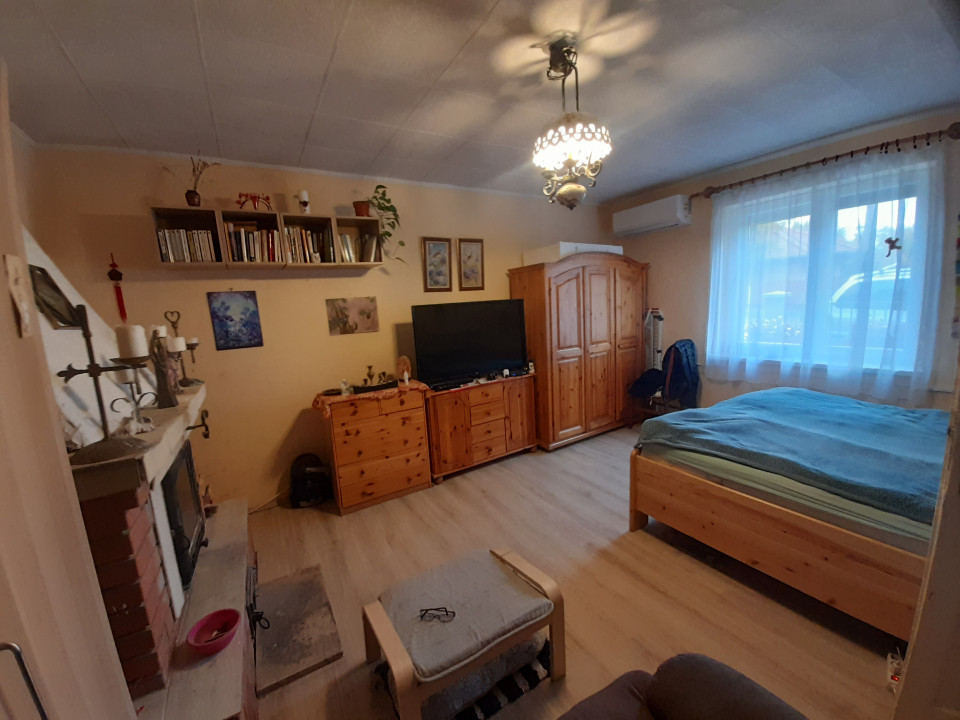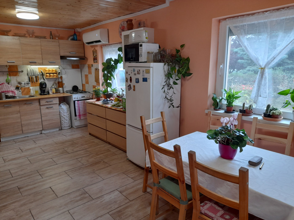 Kb 4 m2-es előterasz, közlekedő, zuhanyozós fürdőszoba toilettel, kamra, nagy étkezős konyha ( amerikai konyha jellegű)+ kb 12 m2-es nyitott terasz, 2 szoba egyikben kandalló.