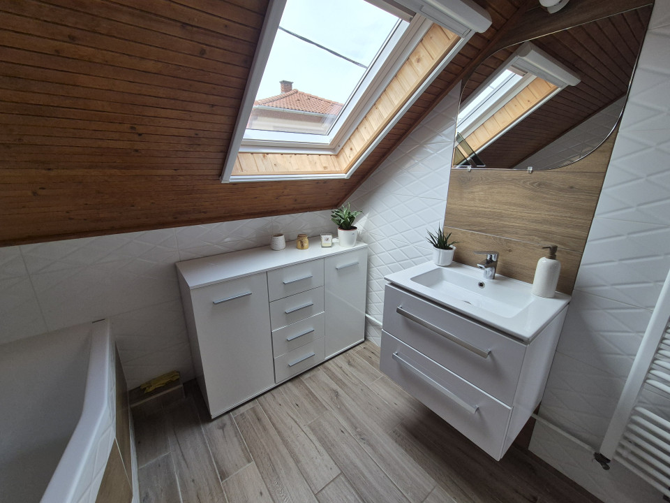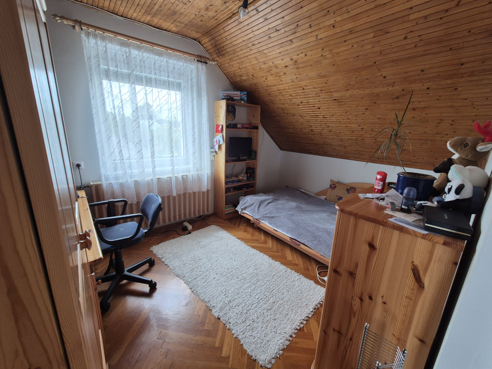 A tetőtérben van a 4 hálószoba, közlekedő, fürdőszoba és WC, erkély