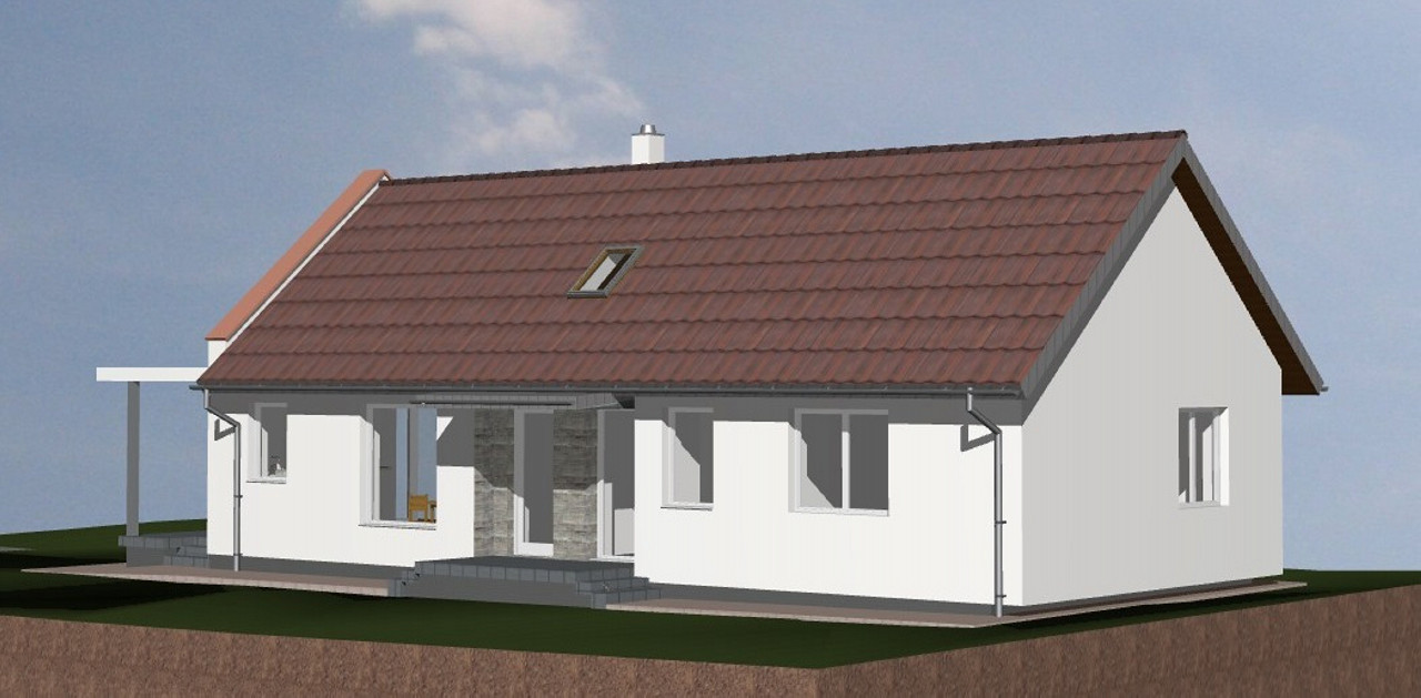 Helyiségek: szélfogó, étkező, konyha, nappali, kamra, háztartási helyiség, fürdő, közlekedő és 3 db szoba