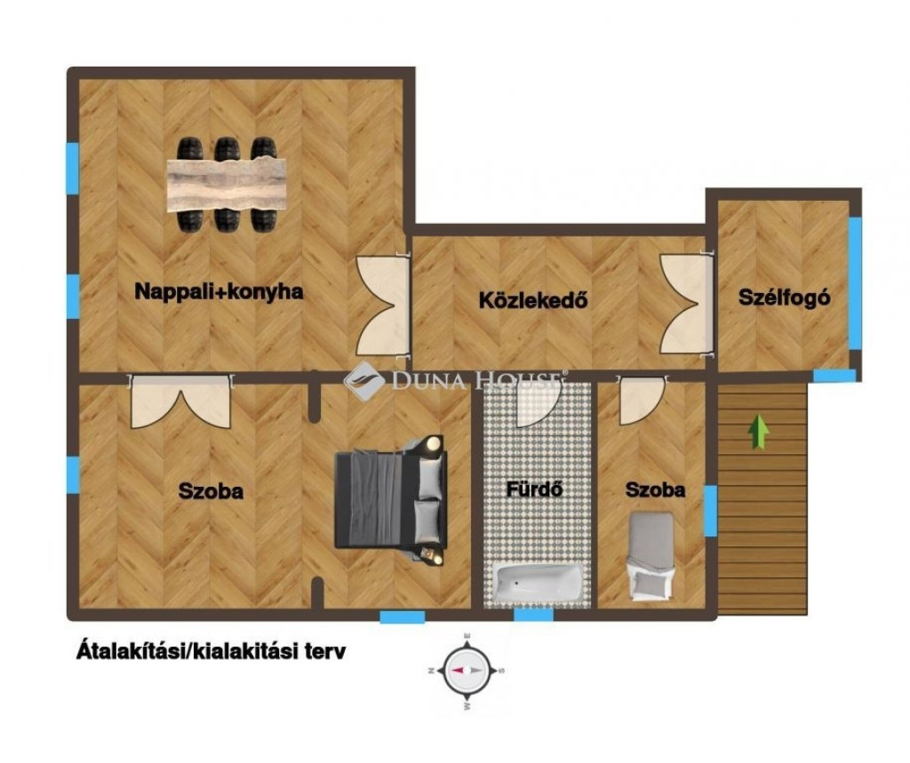 A régi fa parketta megóvás céljából laminált padlóval fedett, így az bármikor visszaállítható és felújítható.