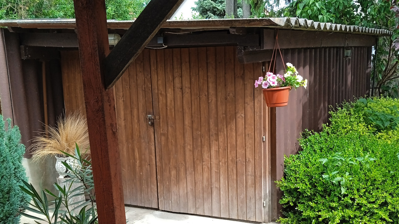 A szépen karbantartott kertben fúrt kút, kerti csap, tároló, fedett autóbeálló, valamint örökzöld növények biztosítják az igazi otthonos hangulatot.