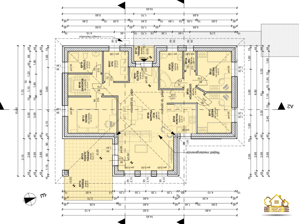 A lakás belső elrendezése rendkívül praktikus és kényelmes. A hálószobák száma 3, az egyik hálószobához fürdőszoba és egy gardróbszoba kapcsolódik. A tágas amerikai konyhás nappaliból egy 20 m²-es fedett teraszra jutunk. A további 2 hálószoba a külön WC helyiség és a fürdőszoba közelében helyezkedik el. A konyhához közel található a háztartási helyiség, mely tárolás szempontjából is előnyös.