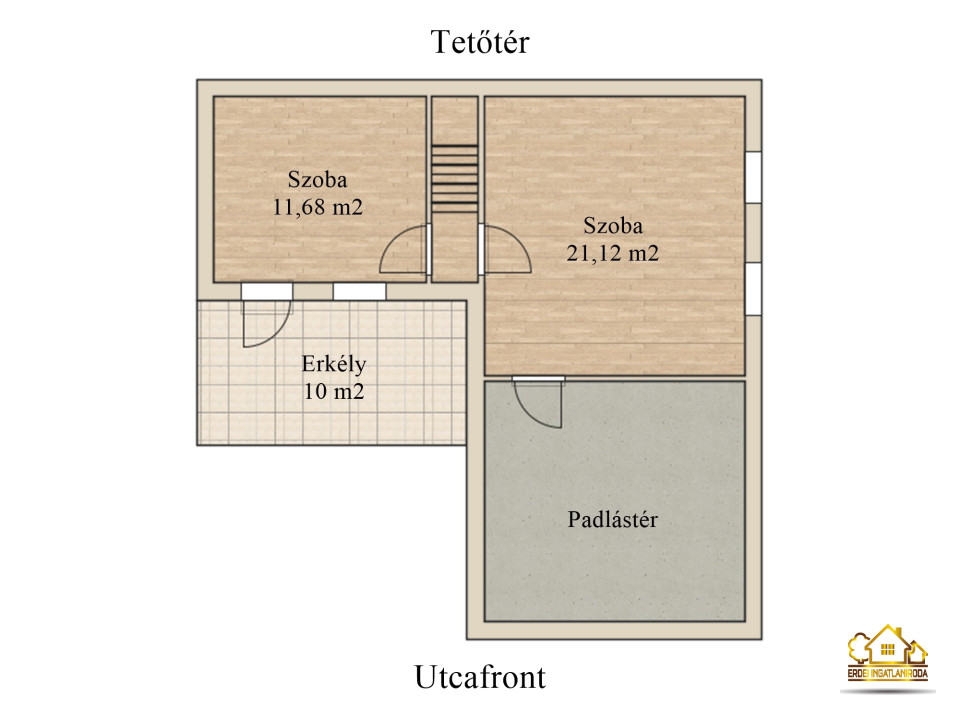 Az ingatlanban a földszinten található egy tágas konyha-étkező-nappali, egy zuhanyzós fürdőszobával és egy szobával, melyből a tetőtérbe jutunk. A tetőtérben 2 hálószoba található, az egyikhez egy 10 m²-es erkély tartozik, ez a szoba klímával felszerelt. A másik tetőtéri szobából egy ajtó vezet ki a padlástérre.