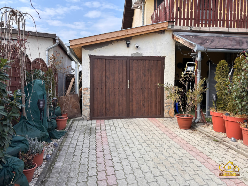A parkosított telek nagysága 197 m², a kocsibeálló térkövezett, az automata kapun keresztül 2 autó számára kényelmes a parkolás.