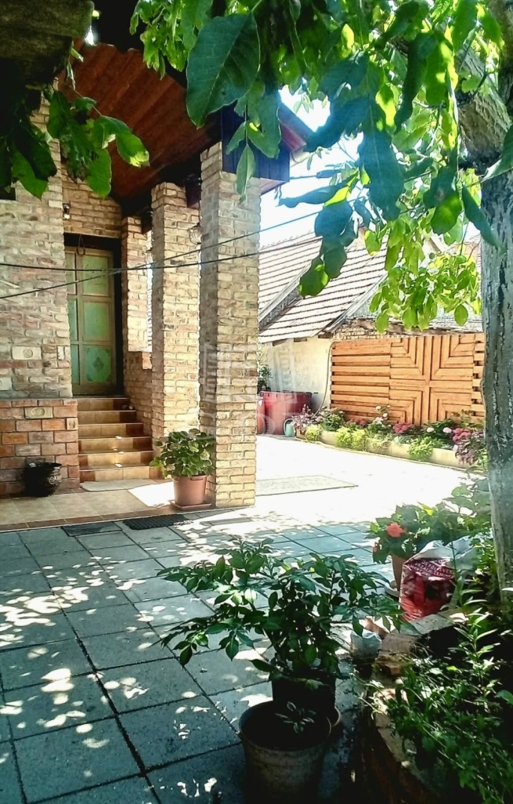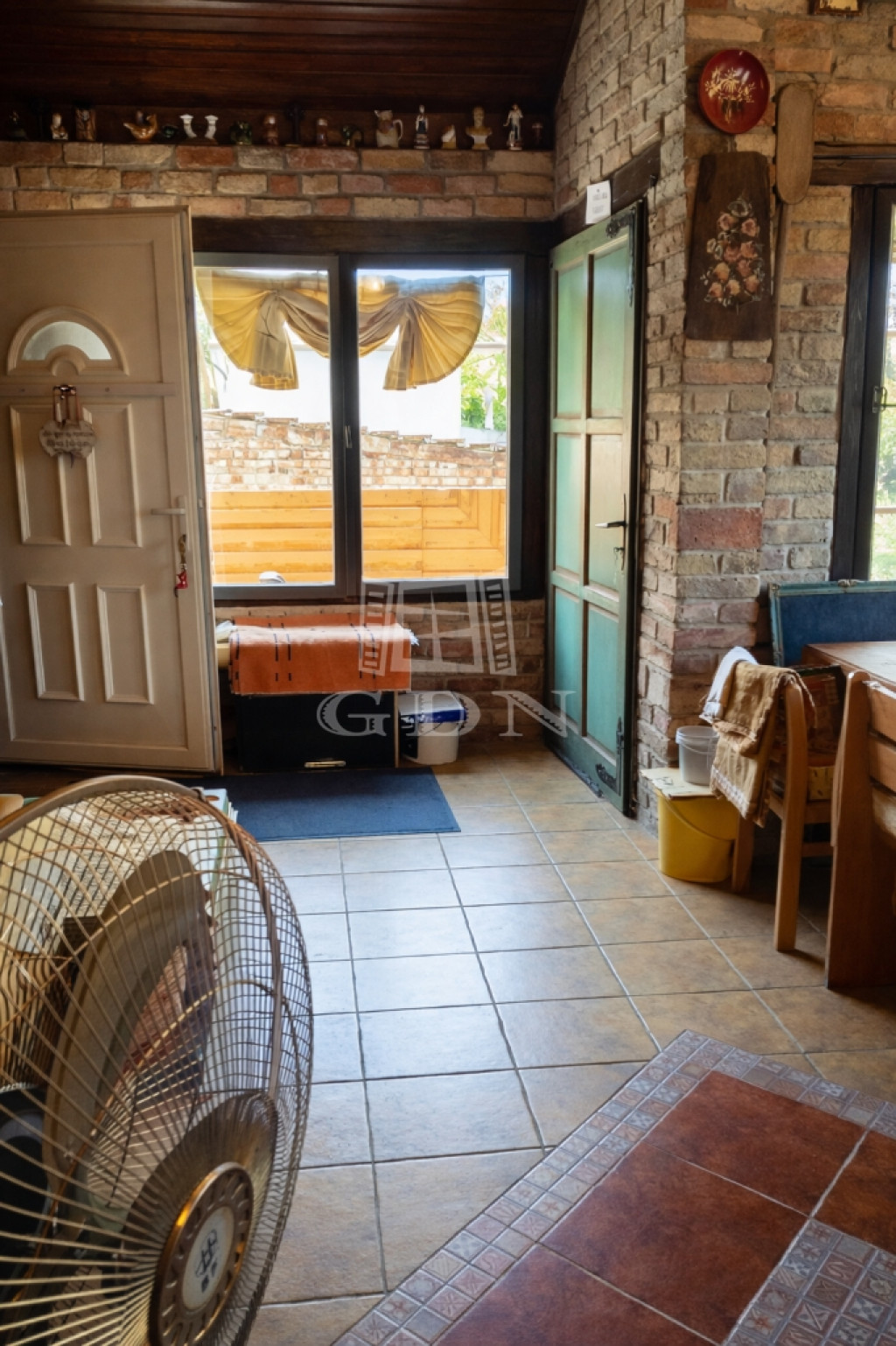 A házhoz kapcsolódik egy hangulatos, rusztikus stílusú, fedett terasz, amely egyedi elképzelések alapján, gondos kivitelezéssel készült.