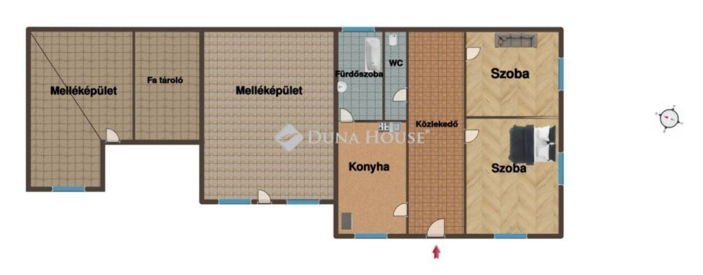 Az összközműves ház mellett találhatóak melléképületek, kemence és egy fa tároló is.