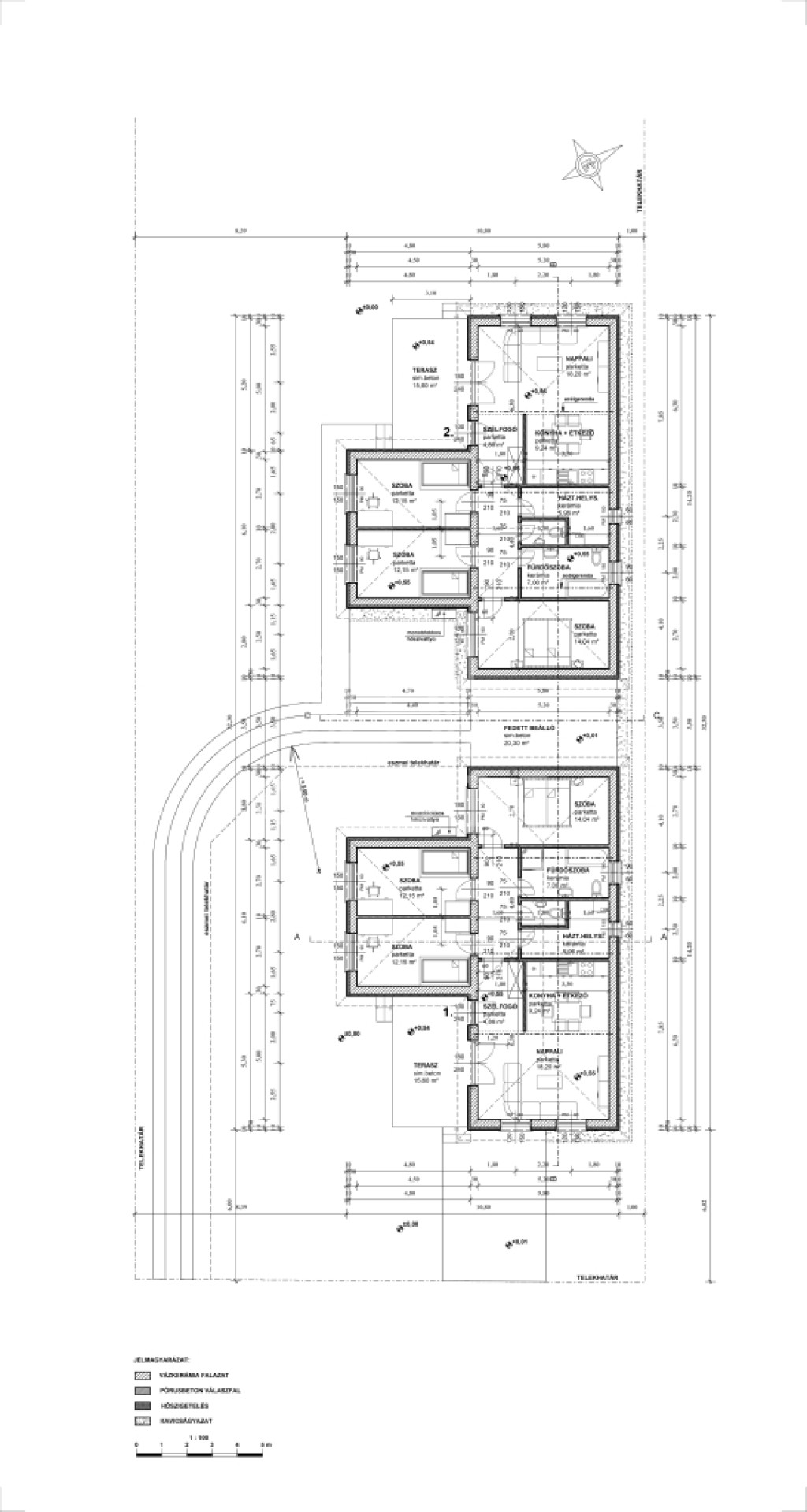 A fedett gépkocsibeálló az utcafronti házhoz tartozik, melynek kizárólagos használatú telekrésze 413 m2. A hátsó háznak 994 m2-es a kizárólagos használatú telekrésze.