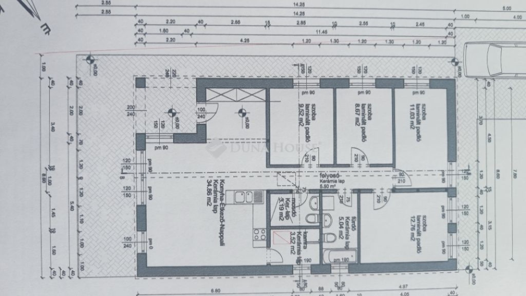 többi helyiségben kerámia burkolat készül, kísérőlábazattal. A tetőn cserép fedés van 40°-os hajlásszögre.