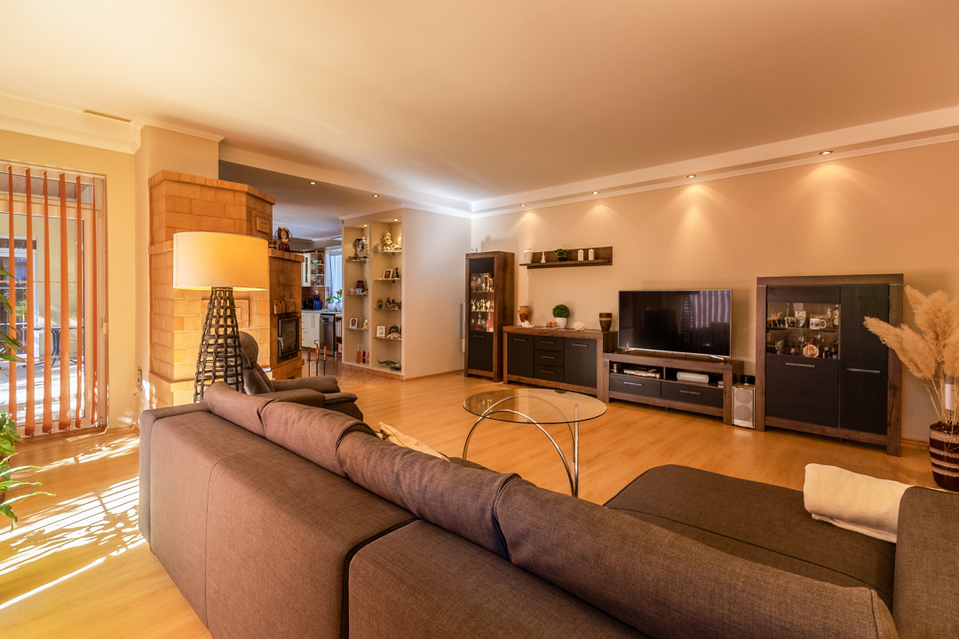 A 1690 m²-es, ősfás, parkosított dupla telken elhelyezkedő otthon 2004-ben épült, minőségi anyagokból.