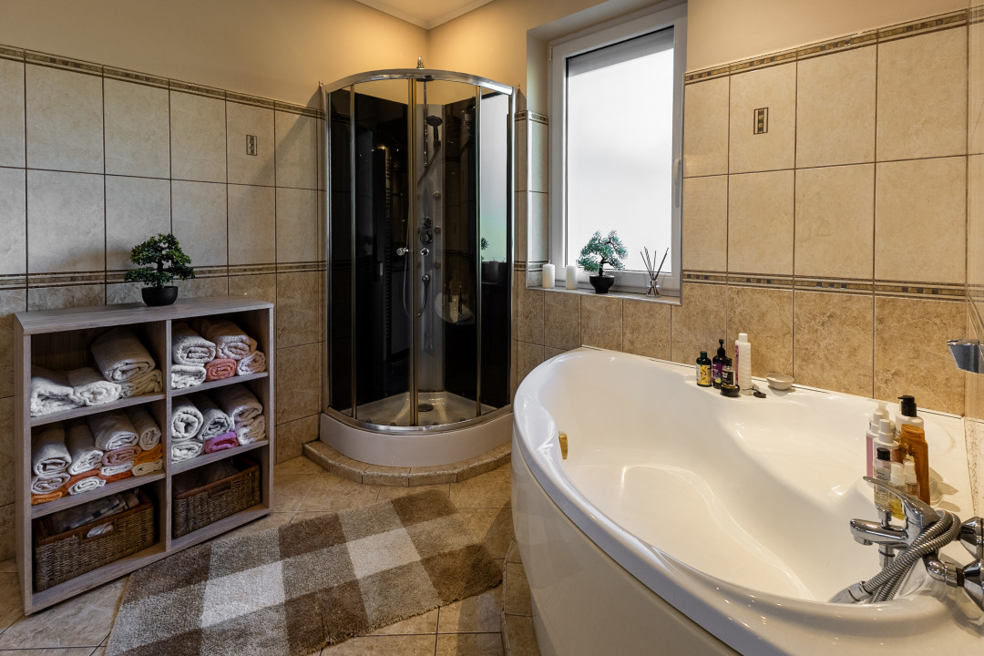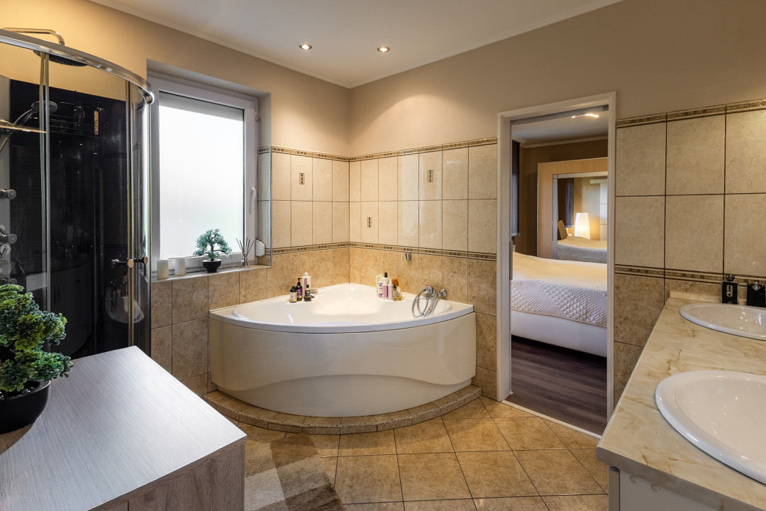 A házhoz 30 m²-es fűthető dupla garázs tartozik.