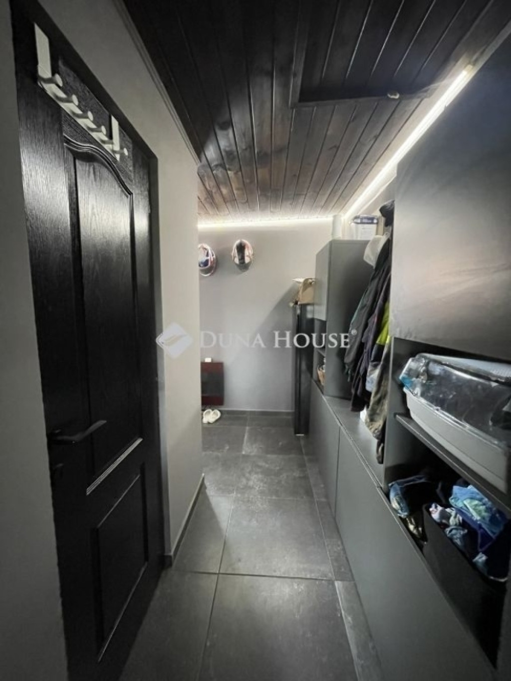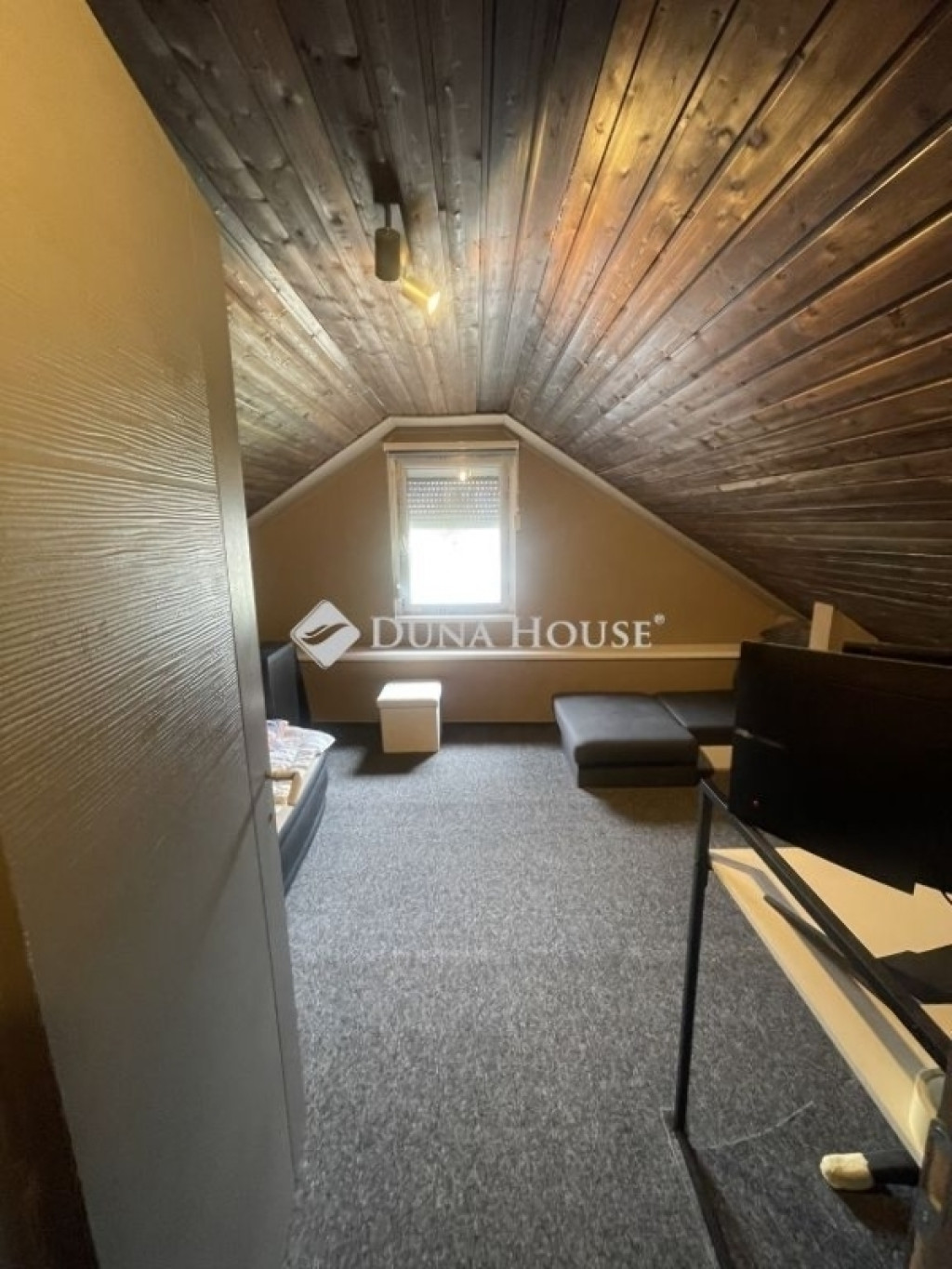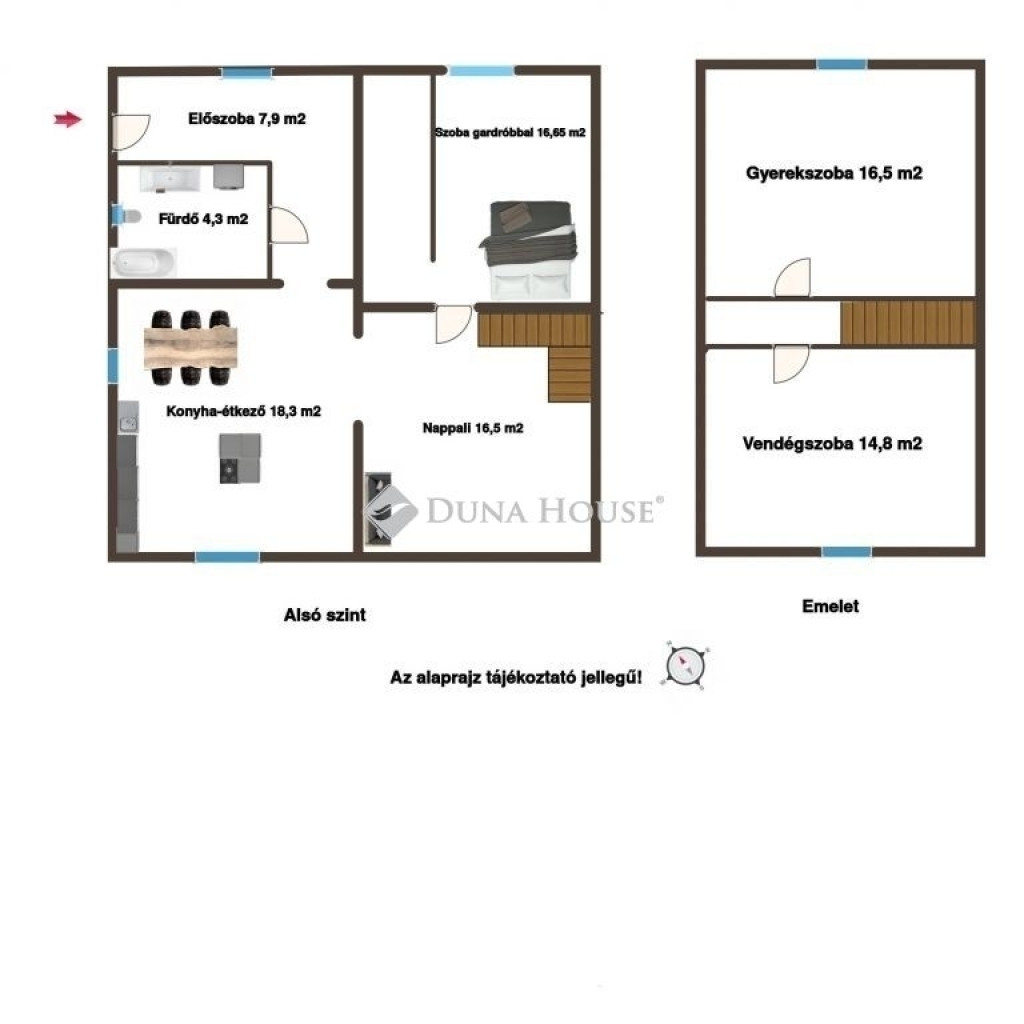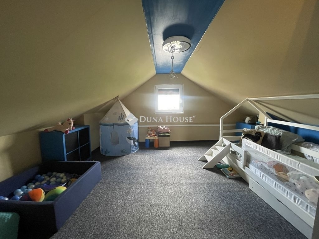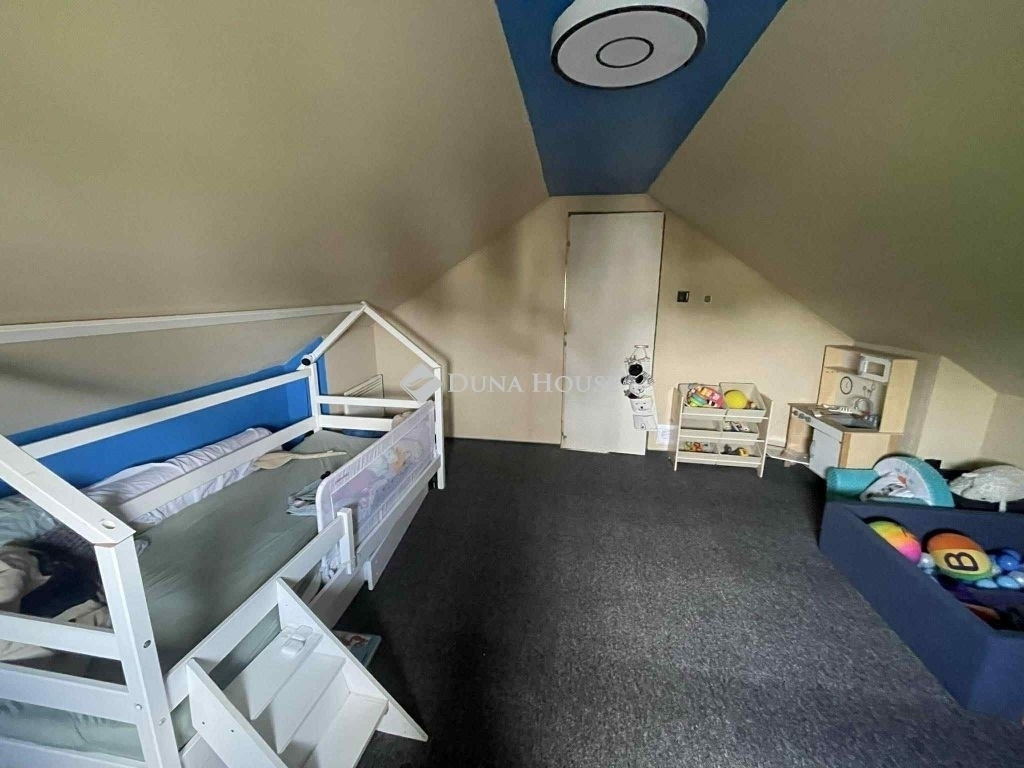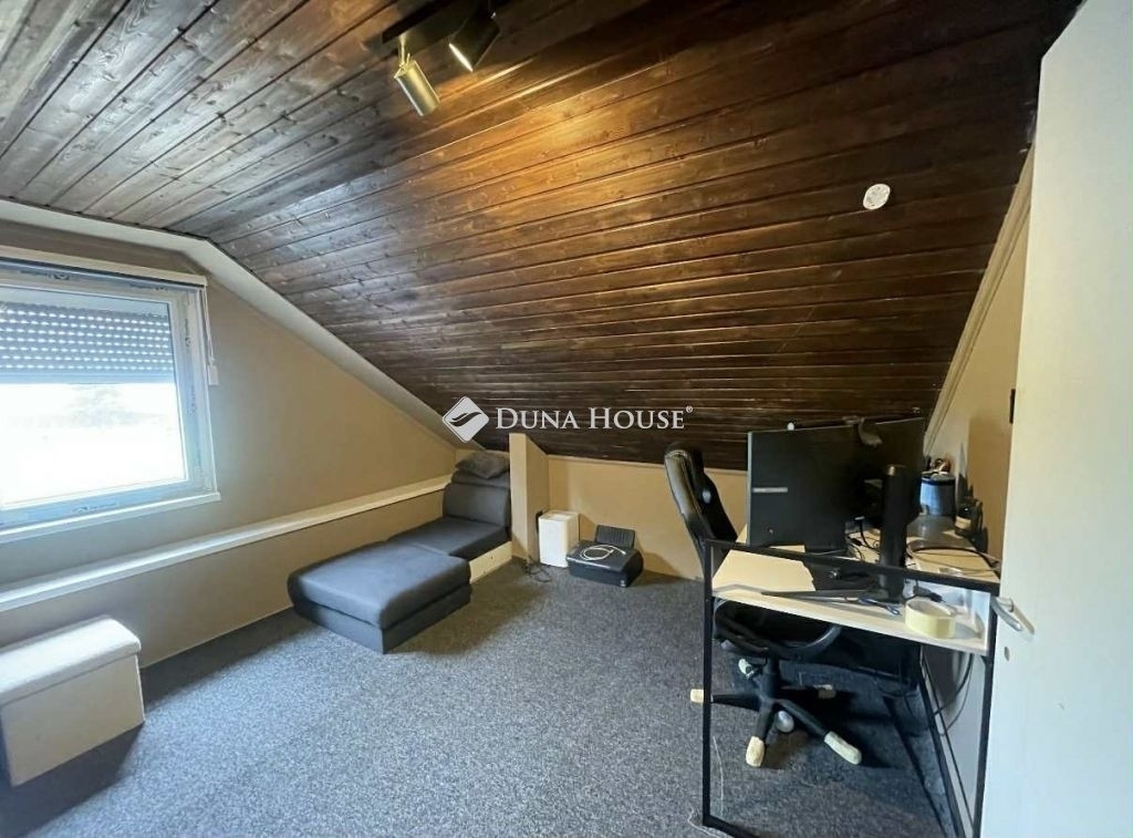 Az alsó szinten előszoba, konyha, étkező, gardrób, hálószoba és egy hangulatos nappali található, ahonnan lépcső vezet a beépített tetőtérbe. Az emeleten két szoba és közlekedő került kialakításra, így a ház ideális lehet családok számára is.