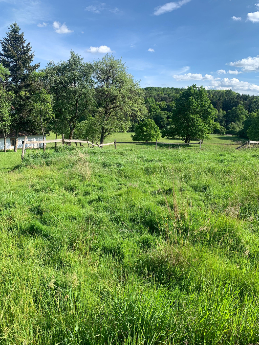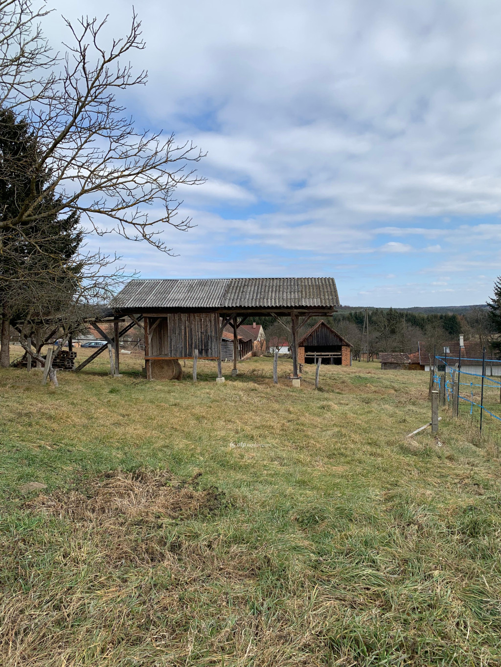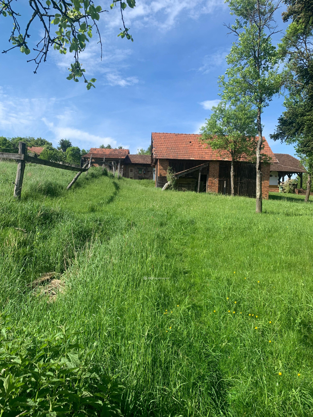 Az eladásra kínált ingatlan a domb tetején helyezkedik el, lábai előtt több hektárnyi rét, erdő, legelő, patak.