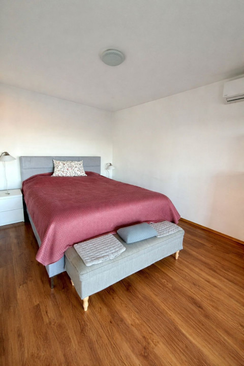 Az emeleti, 121 m2-es lakótér világos és kényelmes elrendezésű. A nappali, a konyha-étkező és a három szoba tágas életteret biztosít a család számára. Több helyiségből közvetlen teraszkapcsolat nyílik, így a belső terek természetesen kapcsolódnak a kültéri pihenőhelyekhez. A ház nagy üvegfelületeinek köszönhetően rendkívül világos: a nyugati tájolású nappali és a déli fekvésű étkező egész nap természetes fényben fürdik.