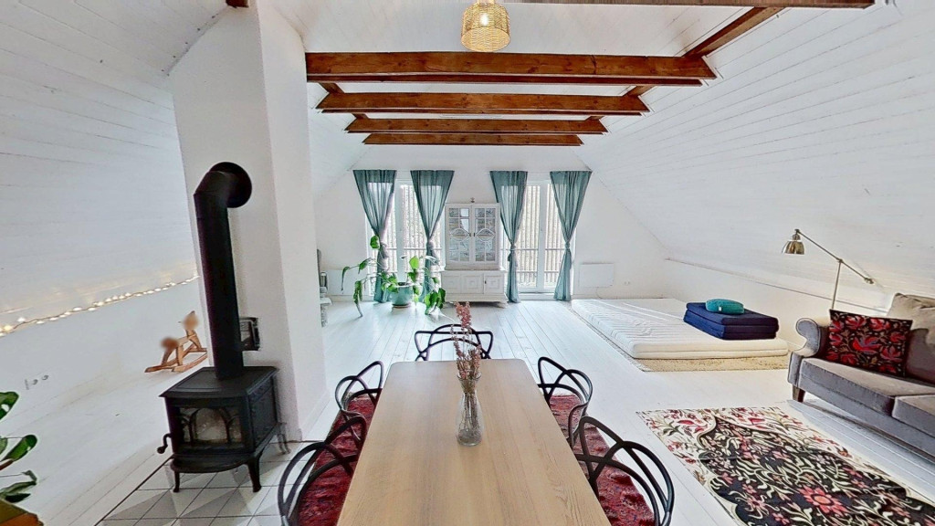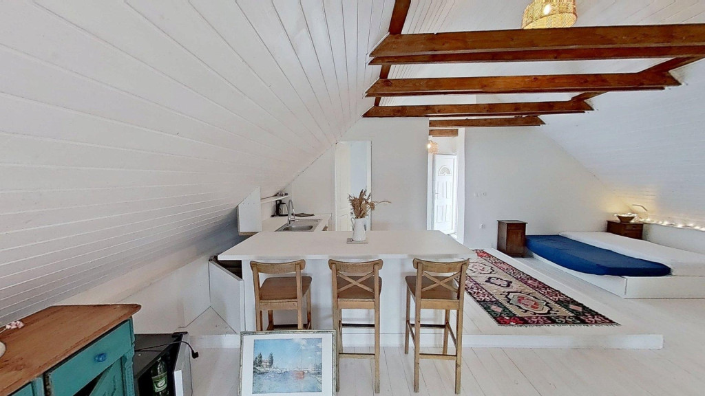 Az emeleti lakótér külső lépcsőn, az udvaron keresztül közelíthető meg, összesen 60 m2 alapterületű, egy légtér, köszönhetően a 4 m-es belmagasságnak. Itt egy szigetes konyha és egy zuhanyzós fürdőszoba került kialakításra. 2024-ben építette be a tulajdonos a tetőteret, falazata Porotherm tégla, 10 cm-es külső szigeteléssel. Az épület betonfödémes, a felújítás alkalmával teljes hájazatcserén esett át, fedése hódfarkú cserép. Fűtéséről Jotul norvég kandalló, klíma és pár fali panel gondoskodik, melegvízellátásáról pedig egy 100 literes villanybojler.