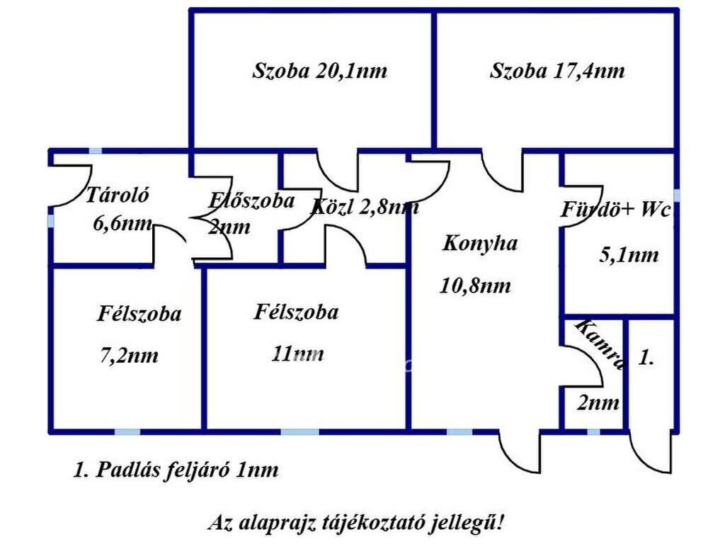 Az ingatlan helyiségei: 2 szoba, 2 félszoba, előszoba, közlekedő, konyha, fürdőszoba wc-vel, kamra , tároló. A padlásfeljáró a teraszról érhető el.