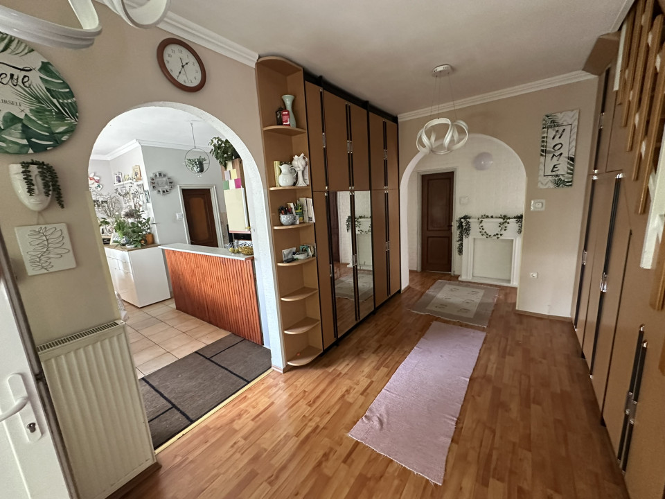 A szobák és közlekedő laminált parkettásak, a többi helyiség járólappal burkolt. A közlekedőben és a lépcső alatt beépített szekrények biztosítják a kényelmes tárolást.