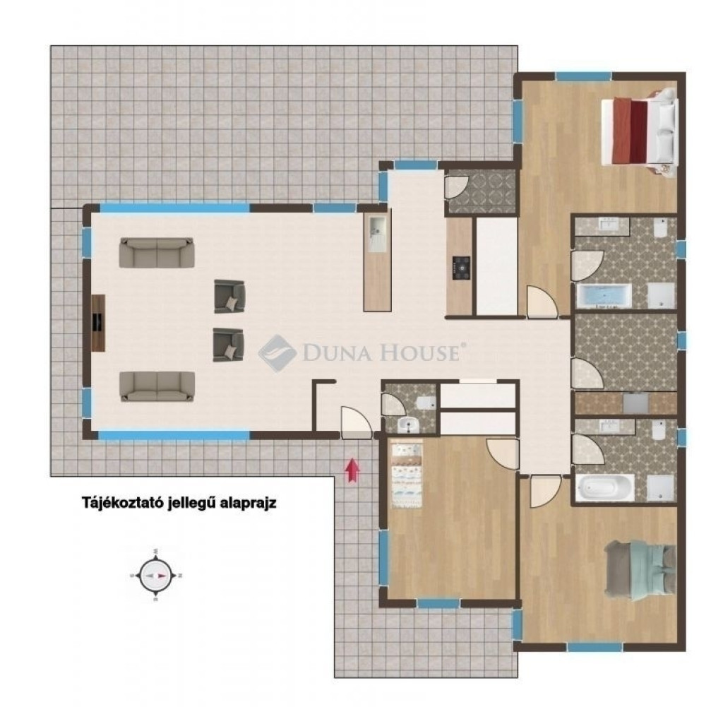 - Egyszintes, kiváló elrendezésű: tágas nappali, 3 világos hálószoba, 2 teljes értékű fürdőszoba és külön vendégmosdó