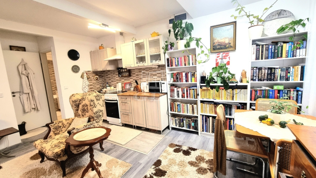 Az épület felújított felső szintjén előszoba, amerikai konyhás nappali, hálószoba, fürdőszoba található.