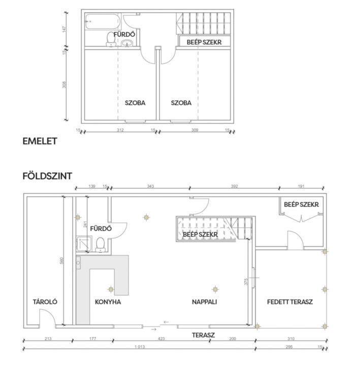 Emeleten 2 külön bejáratú szoba és egy kádas fürdőszoba WC-vel kialakításra került.