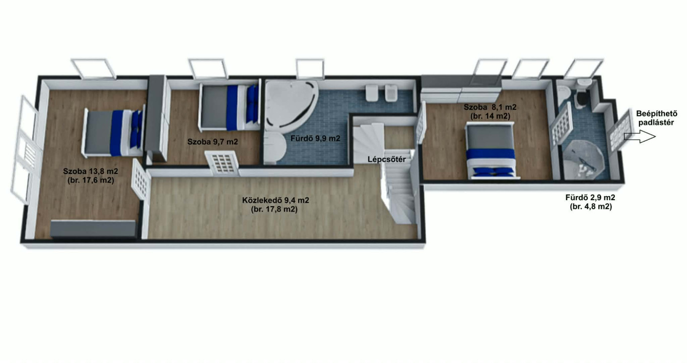 Tetőtér nagy része beépített, ám további beépítés lehetséges