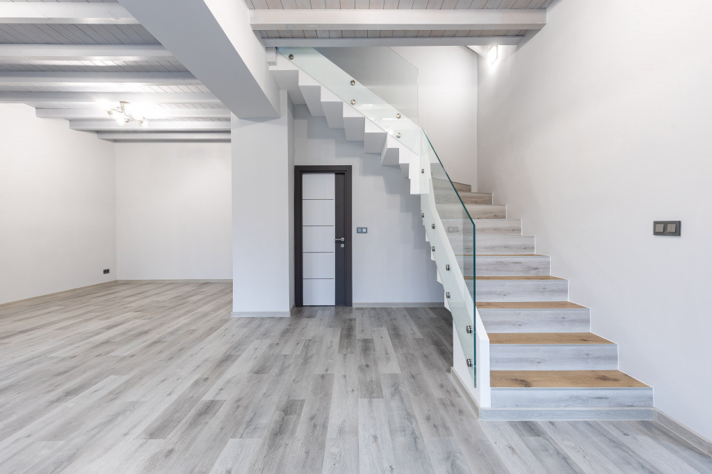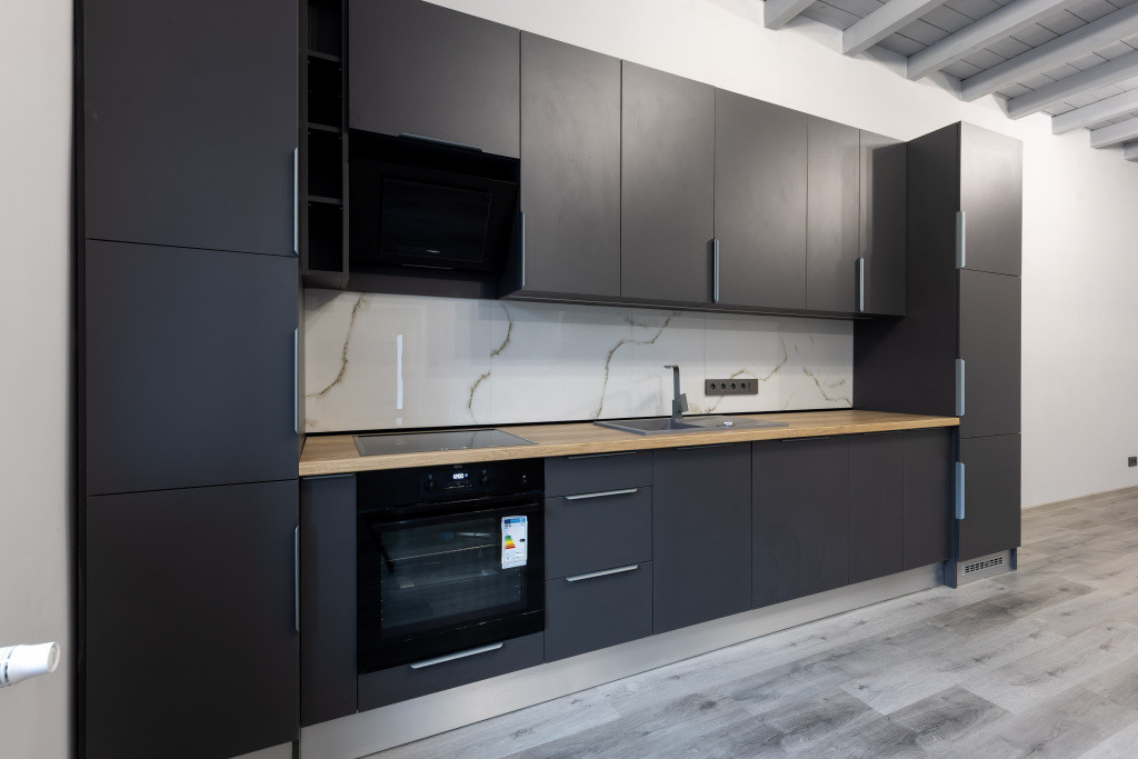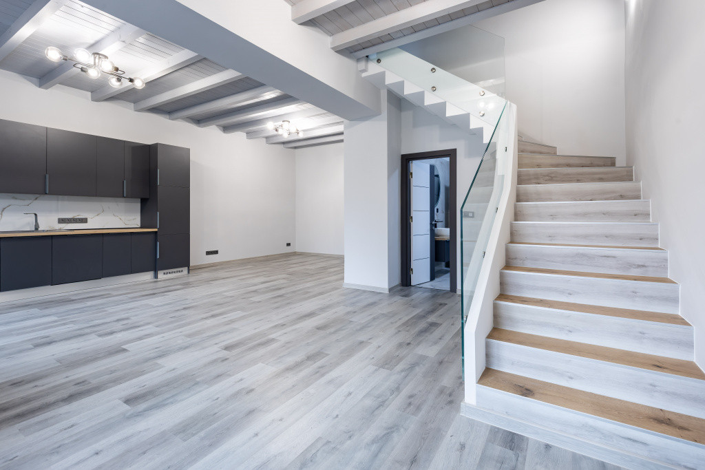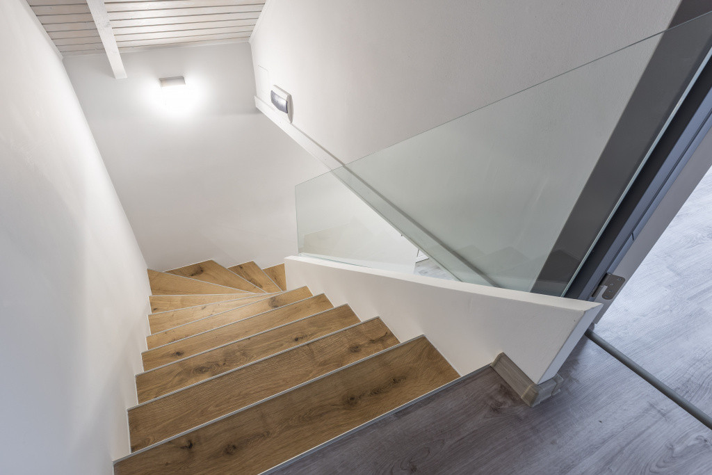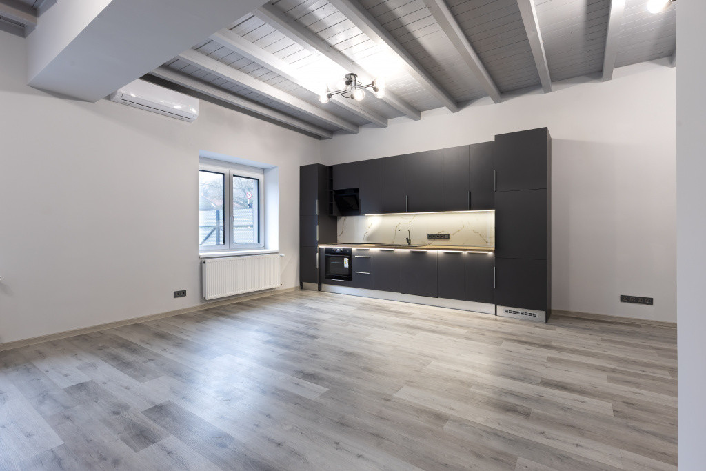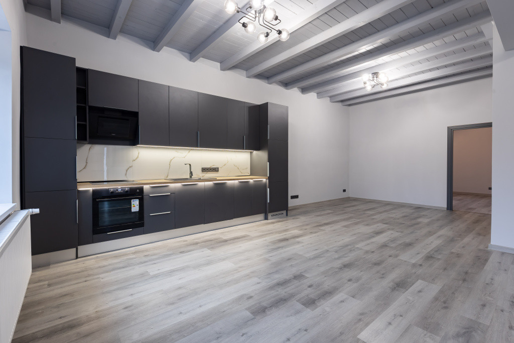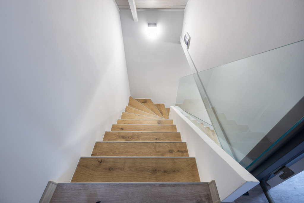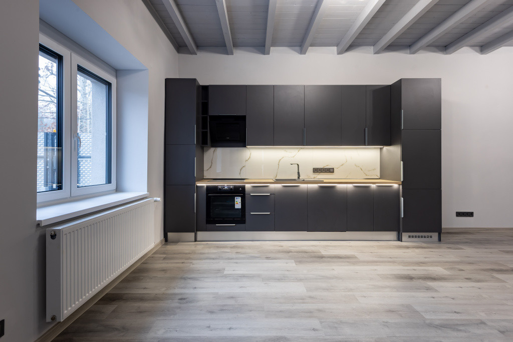 Az alsó szinten egy tágas, világos amerikai konyhás nappali került kialakításra, modern, letisztult gépesített konyhabútorral és közvetlen kertkapcsolattal. A nagy üvegfelületeknek köszönhetően a tér egész napfényben úszik. Ezen a szinten található továbbá egy hálószoba, gardrób helyiség, igényesen kialakított fürdőszoba.