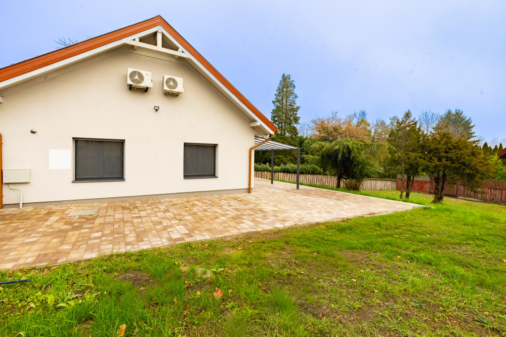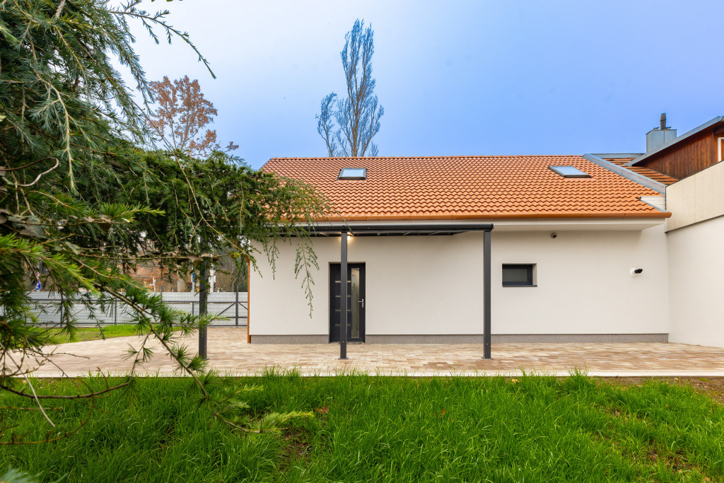 A kert rendezett, kellemes méretű, kiválóan alkalmas pihenésre vagy családi összejövetelekre. A ház mellett kialakított, térkövezett, fedett terasz tökéletes helyszíne lehet reggeli kávézásoknak vagy esti beszélgetéseknek.