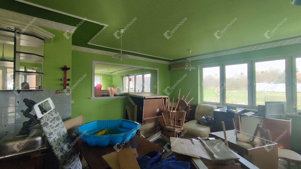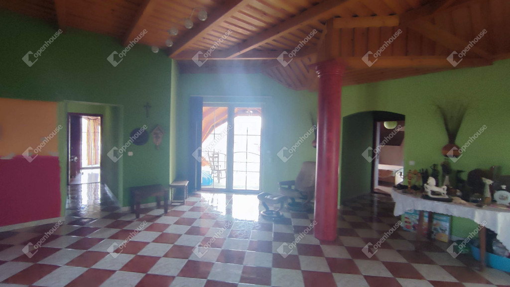 A ház alapterülete 300-négyzetméter. Alapzata beton, falazata 38-as porotherm tégla, beton födém, cserép héjazat. Hőszigetelt nyílászárók, Biztonsági bejárati ajtó. Hűtő fűtő klíma és, Riasztó berendezés is kiépítésre került. Fűtését gázcirkó kazán biztosítja. Teljes területe 1100-négyzetméter. Elhelyezkedése központi. Nagyságából adódóan, több generáció együttélésére is alkalmas. Az alsó szinten két különálló üzlet került kialakításra, mindkettő külön mérő órákkal. Természetesen nagy méretű garázs is tartozik a házhoz, fedett terasszal, térkövezet parkolóval.