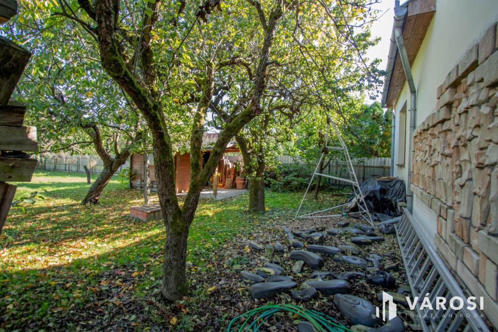 Az udvara parkosított, egy kerti kis tó is található benne, ami egy kis törődésre vár, de nagyon hangulatos hatást kelt így is. Tárolásra egy hangulatos kis faház lett felépítve.