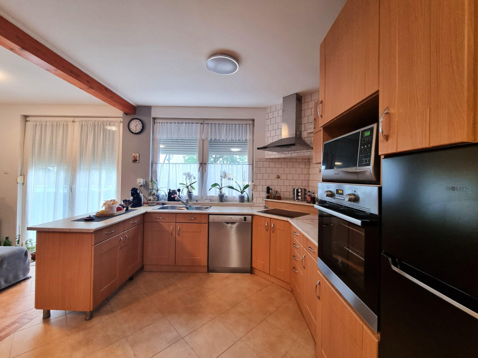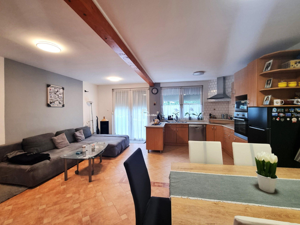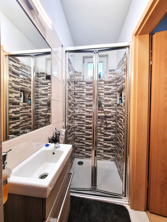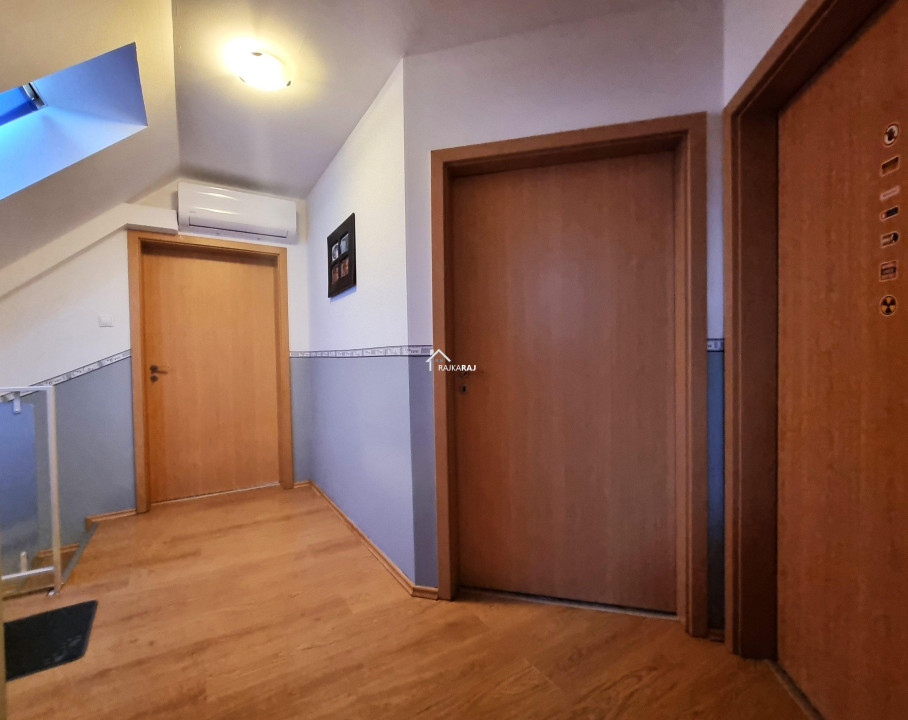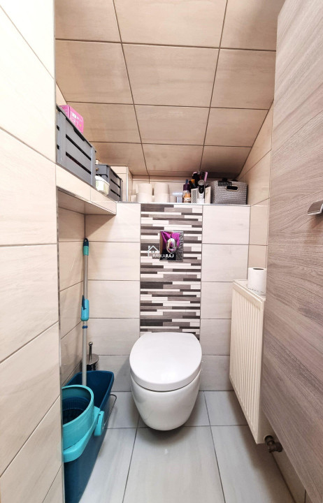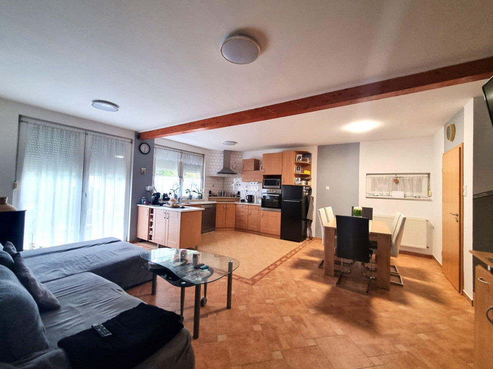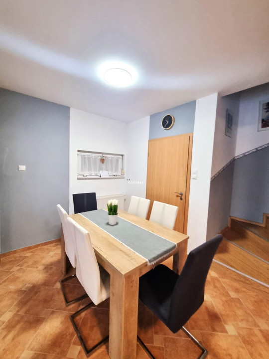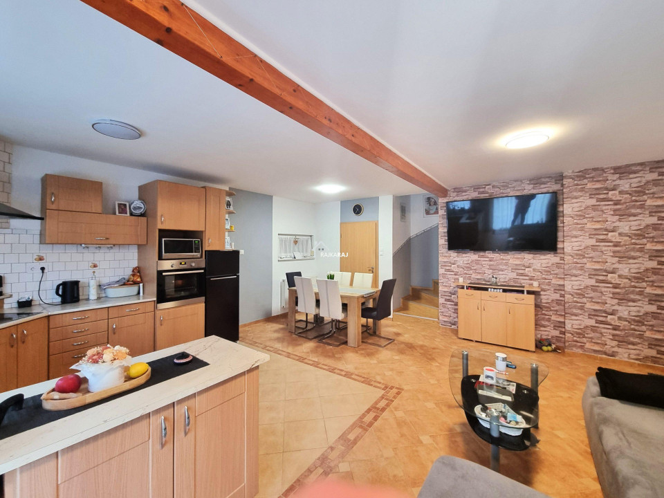 A LAKÁS HELYISÉGEI: (alsó szint) : nappali/amerikai konyha/étkező (30 m2), innen nyíló terasz, 1 szoba amelyet a garázsból alakítottak ki és igény esetén visszaalakítható, wc + tusoló, kamra.