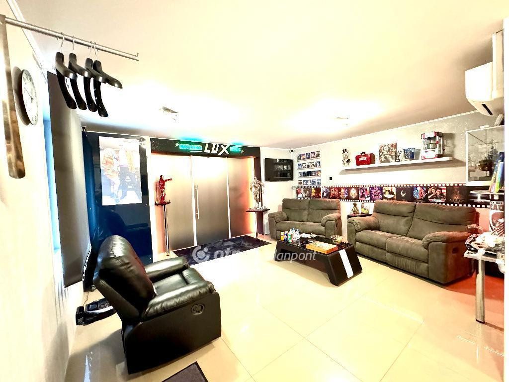A telek, ami két utcafronttal rendelkezik és két teljes értékű, különálló családi házat foglal magában, így ideális nagycsaládosoknak, többgenerációs együttéléshez, befektetési vagy vállalkozási célra is. A 2016-ban épült, 84 m2-es, egyszintes főépület, valamint a 2025-ben épült, 101 m2-es, kétszintes épület együttesen biztosítanak kényelmes és modern életteret. A főépület igazi különlegessége a dedikált, 9 férőhelyes multiplex mozi, amely professzionális hangzással és kényelmes, prémium mozifotelekkel biztosít valódi filmszínházi élményt az otthon nyugalmában.