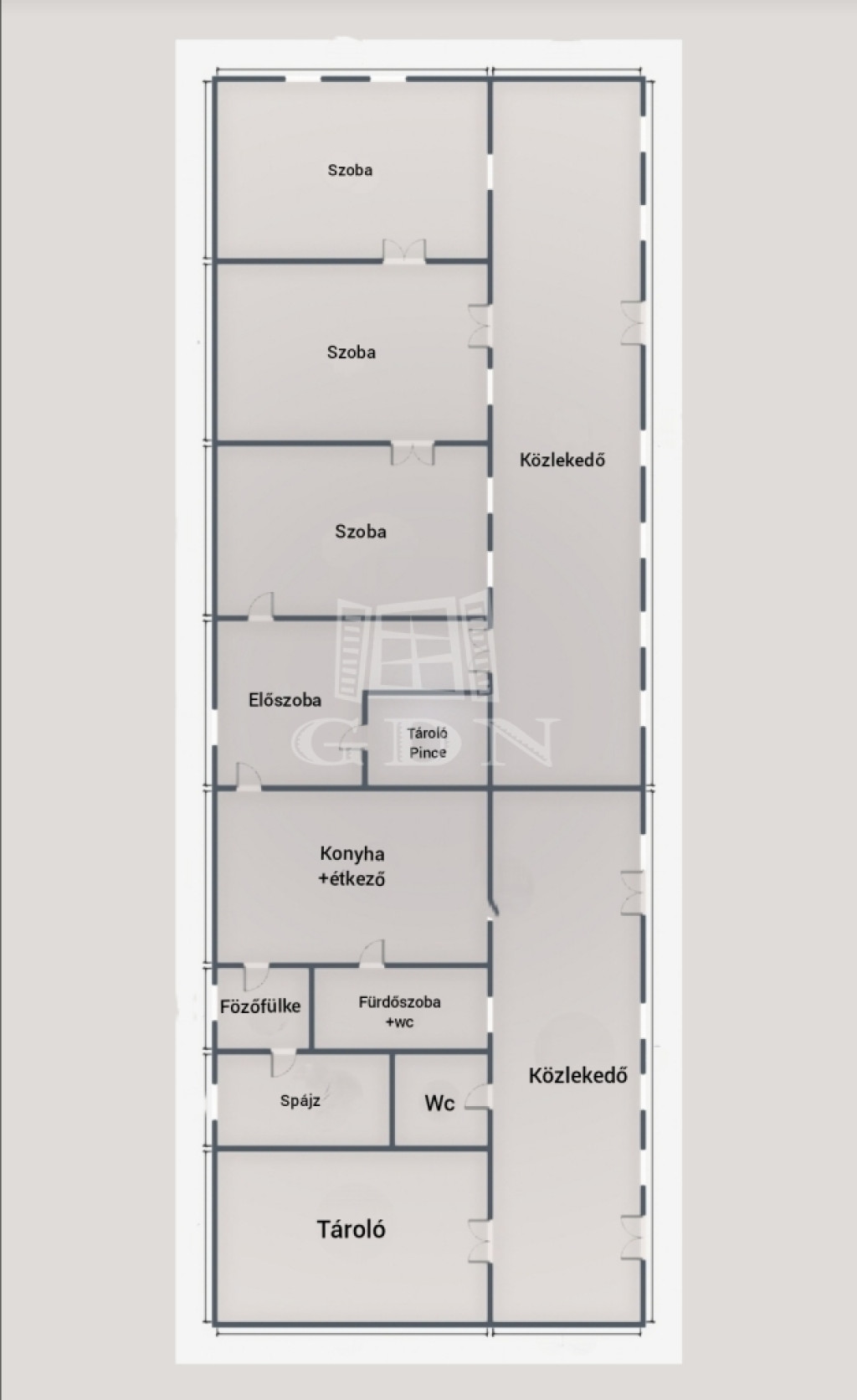 Az ingatlan hosszanti elrendezésű, masszív építésű, több bejárattal rendelkező, így akár kétgenerációs otthonná is alakítható.